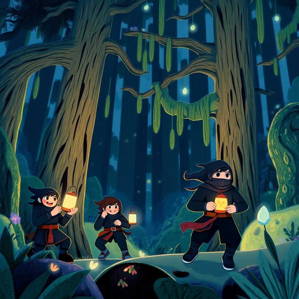 As night fell, the ninjas set out. The Forbidden Forest was eerie. Twinkling fireflies lit their way, while shadows danced eerily among moss-covered trees.
