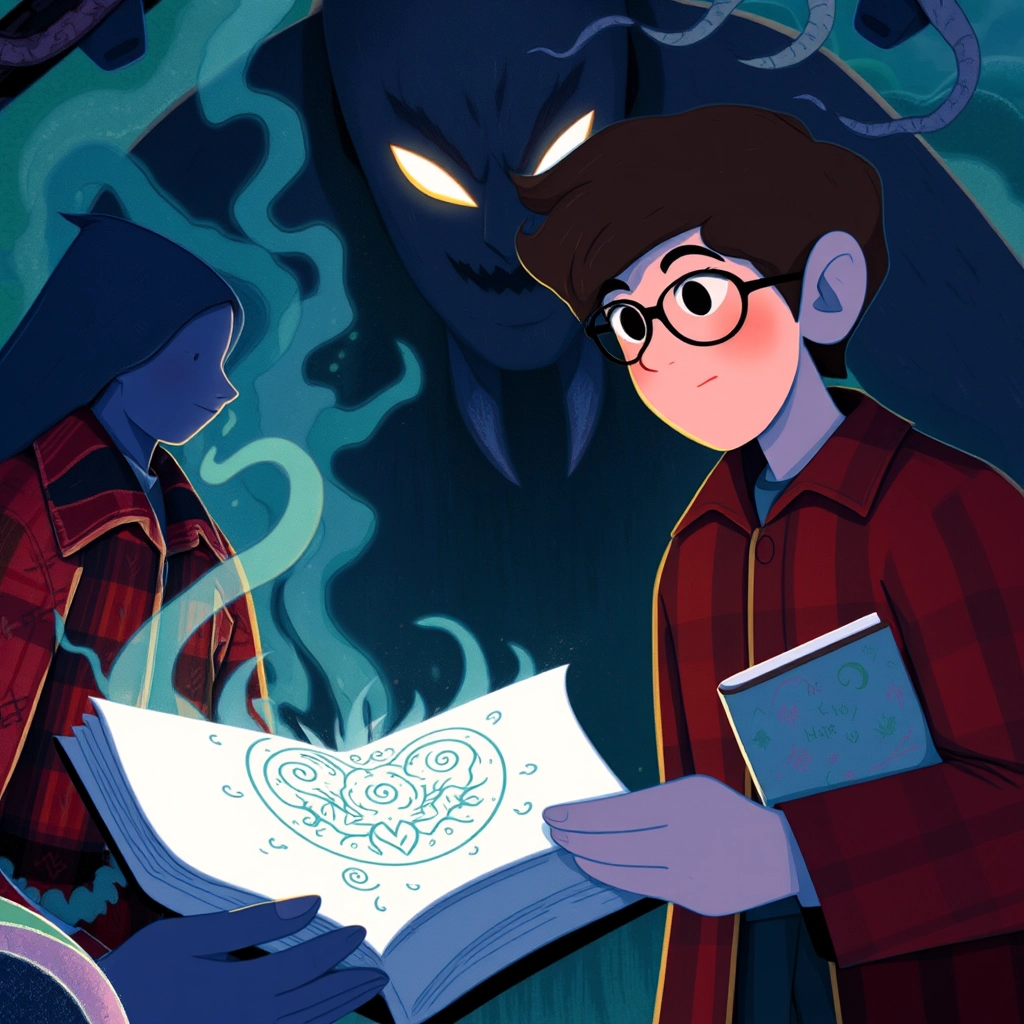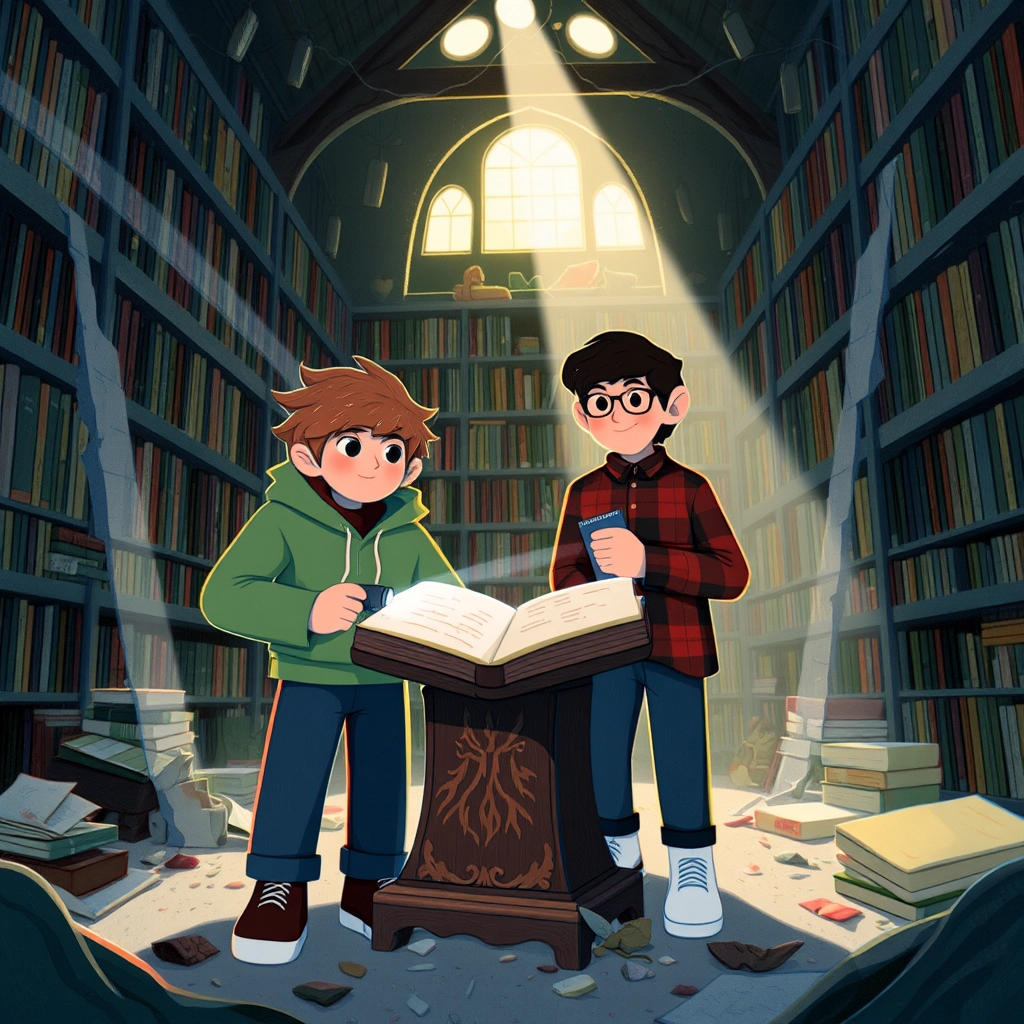 In the gloomy town of Grayhollow, nestled between gnarled trees and perpetual mist, two adventurous boys, [Leo](J52KHYJ7) and [Max](X5S6WCM6), stumbled into the curiosity-shroud of an old, abandoned library. Here, they discovered a peculiar, ancient book with blackened pages that hummed with a strange energy.