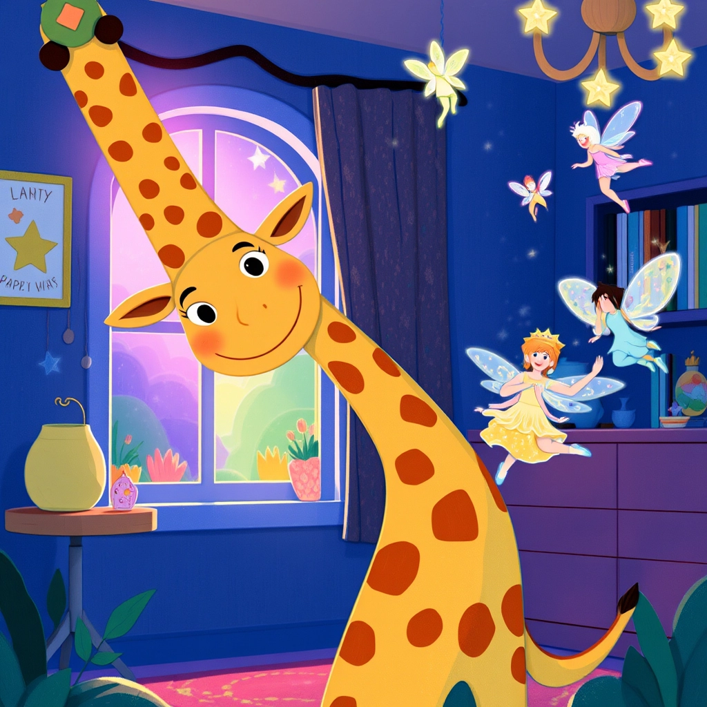 Just then, an upside-down giraffe appeared in the middle of the room. Its long neck made funny shapes as it laughed and tried to pedal an imaginary bicycle through the air!
