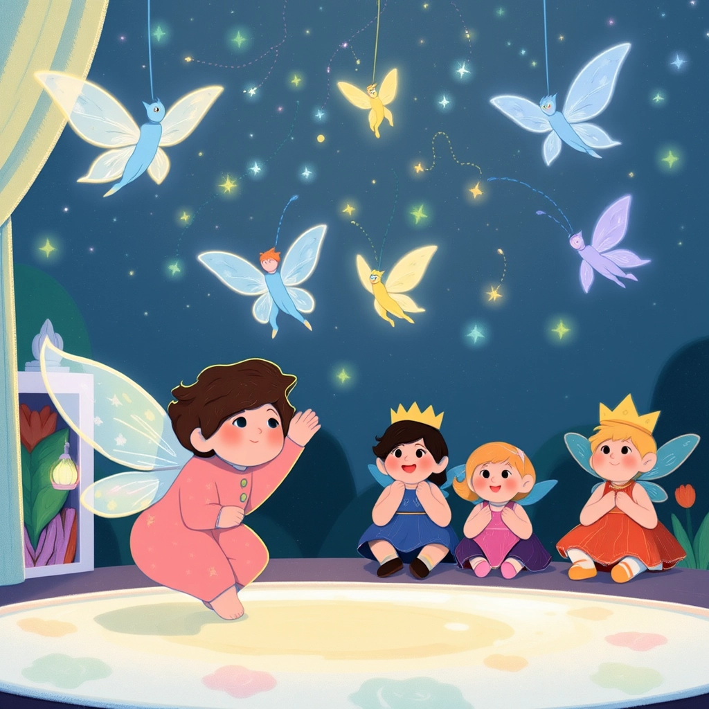 To everyone's surprise, a group of tiny dancing fairies flew out from under the crib. They twirled and giggled, spreading glitter all around the room!