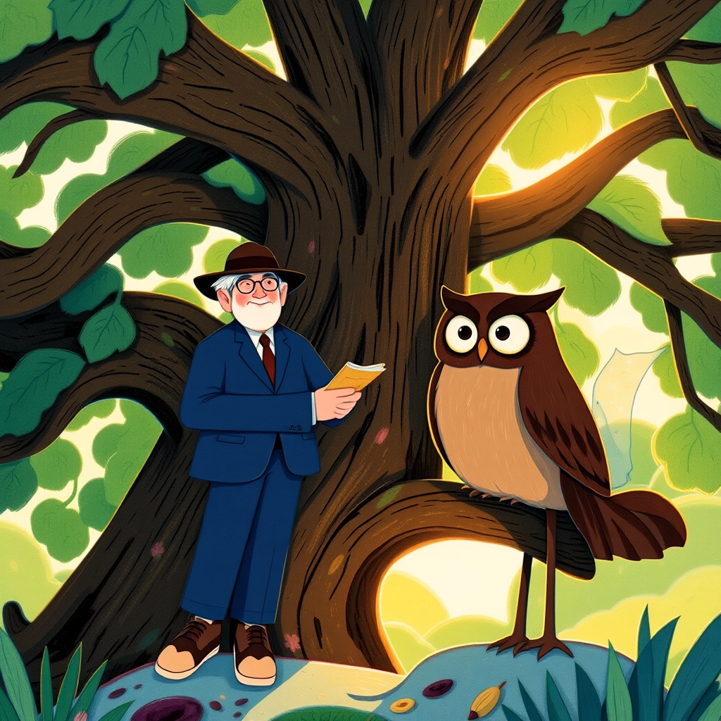 They soon came across a wise old owl named [Professor Hootkins](V2QBCGC7). With a booming ‘Hoo hooo’, the owl asked, 'Why don’t you dance with the tall grass instead of apologizing for it?' [Mr. Sorrypenny](MX3VWG3M) tilted his head. 'Dance with it?' he asked curiously.