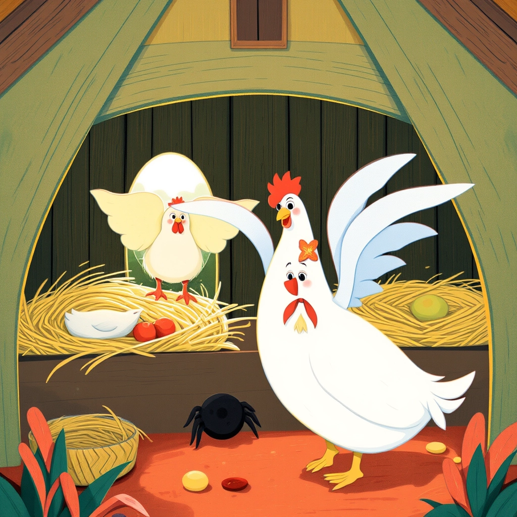 Next, [Sophie](KZ4N9SJ6) climbed to [Coop](DFWBF4TC) the Chicken's roost. 'Can I share your nest?' [Sophie](KZ4N9SJ6) asked. Cluck, cluck! [Coop](DFWBF4TC) spread her wings so wide, [Sophie](KZ4N9SJ6) decided it was a little too flappy for her liking!