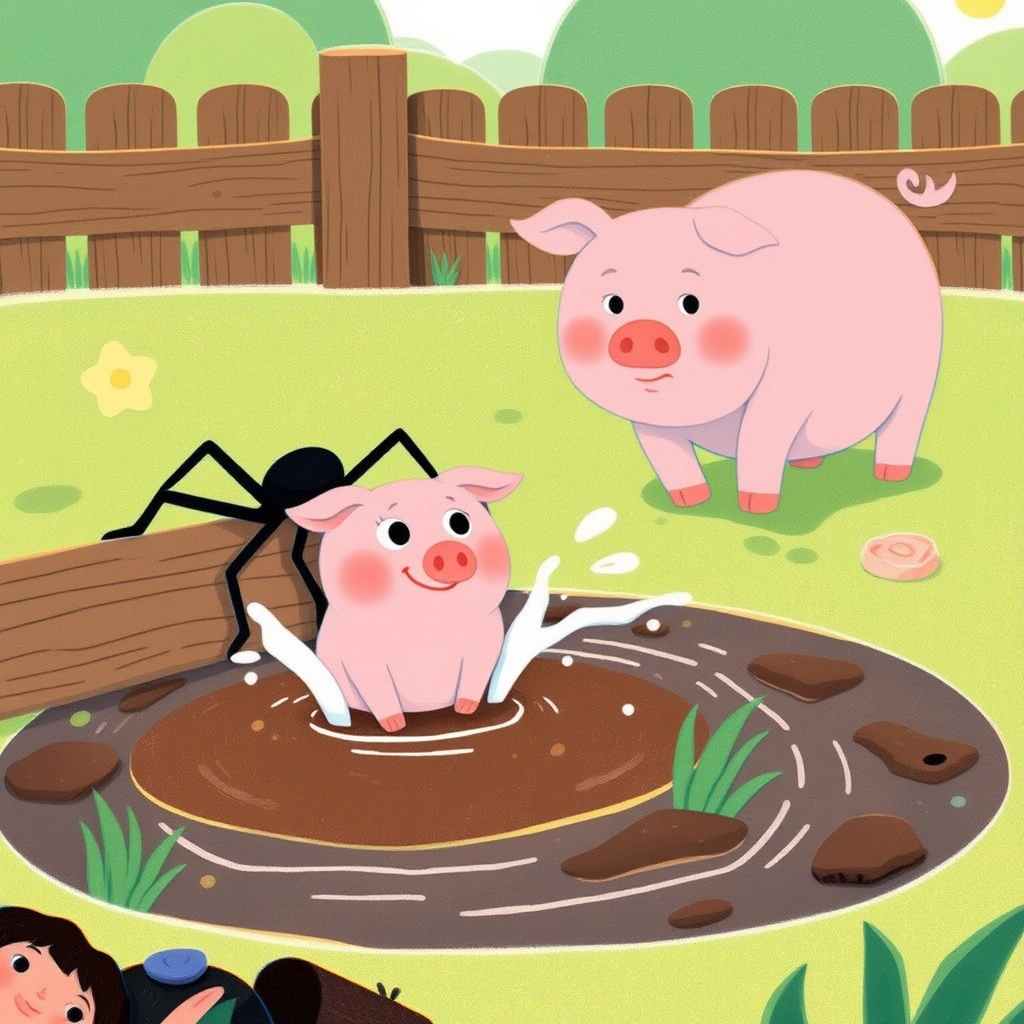 [Sophie](KZ4N9SJ6) wandered to [Penny](G7G6FR9D) the Pig, who was nestled in a muddy pen. 'Can I stay with you?' she asked. Splash! [Penny](G7G6FR9D)’s mud bath was just too messy for [Sophie](KZ4N9SJ6).