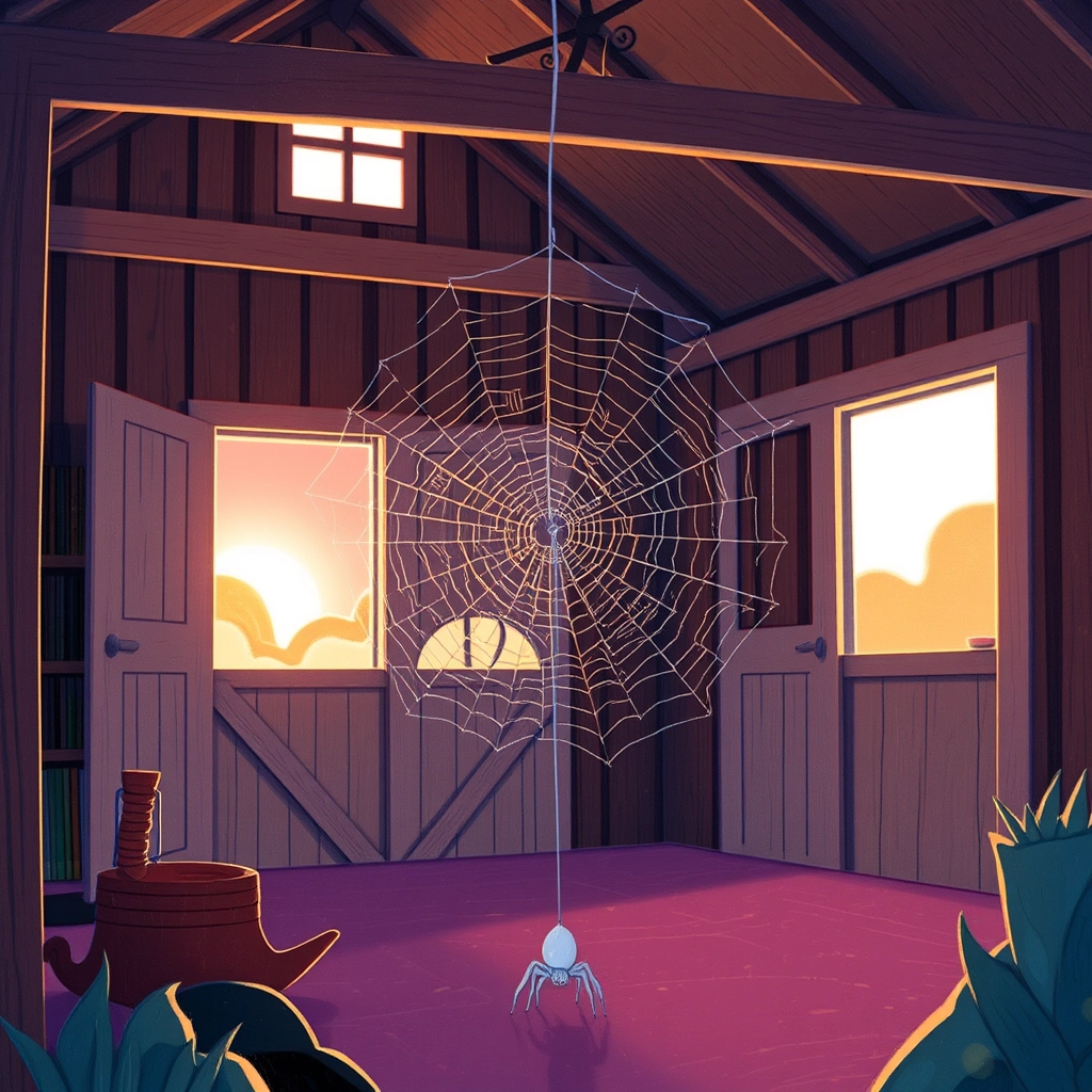 [Sophie](KZ4N9SJ6) started weaving. She danced across the beams of the barn, spinning silky strands of web. By dawn, she had made the most beautiful and cozy web ever!