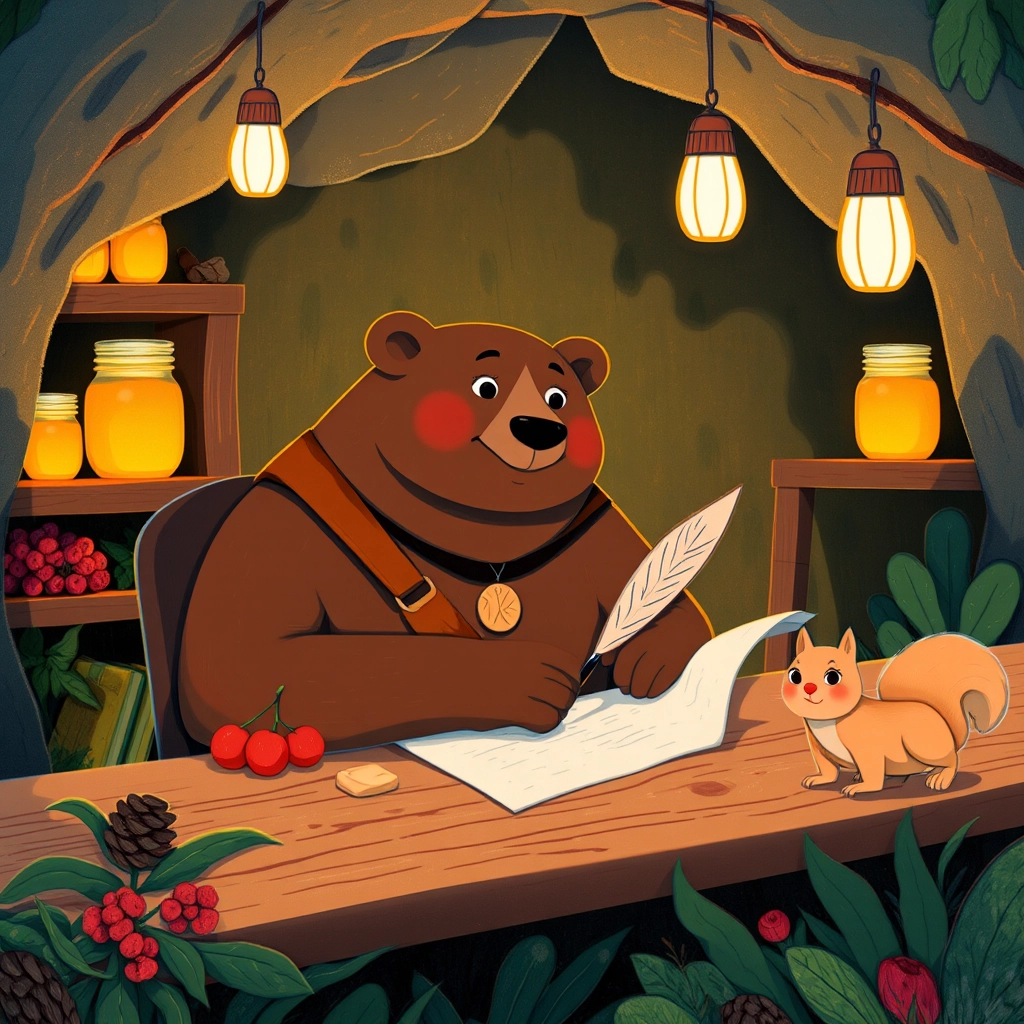 Inside [Boo Baba](GMLDQVMJ)’s cozy cave, full of glowing lanterns and jars of honey, the bear sat at his wooden table with a quill pen in his paw. 'I have an idea!' he exclaimed. He decided he’d organize a surprise party for [Hazelnut](33SDSSK9) – a celebration to show him he was loved. [Boo Baba](GMLDQVMJ) wrote invitations, planning for every animal in the forest to join in.
