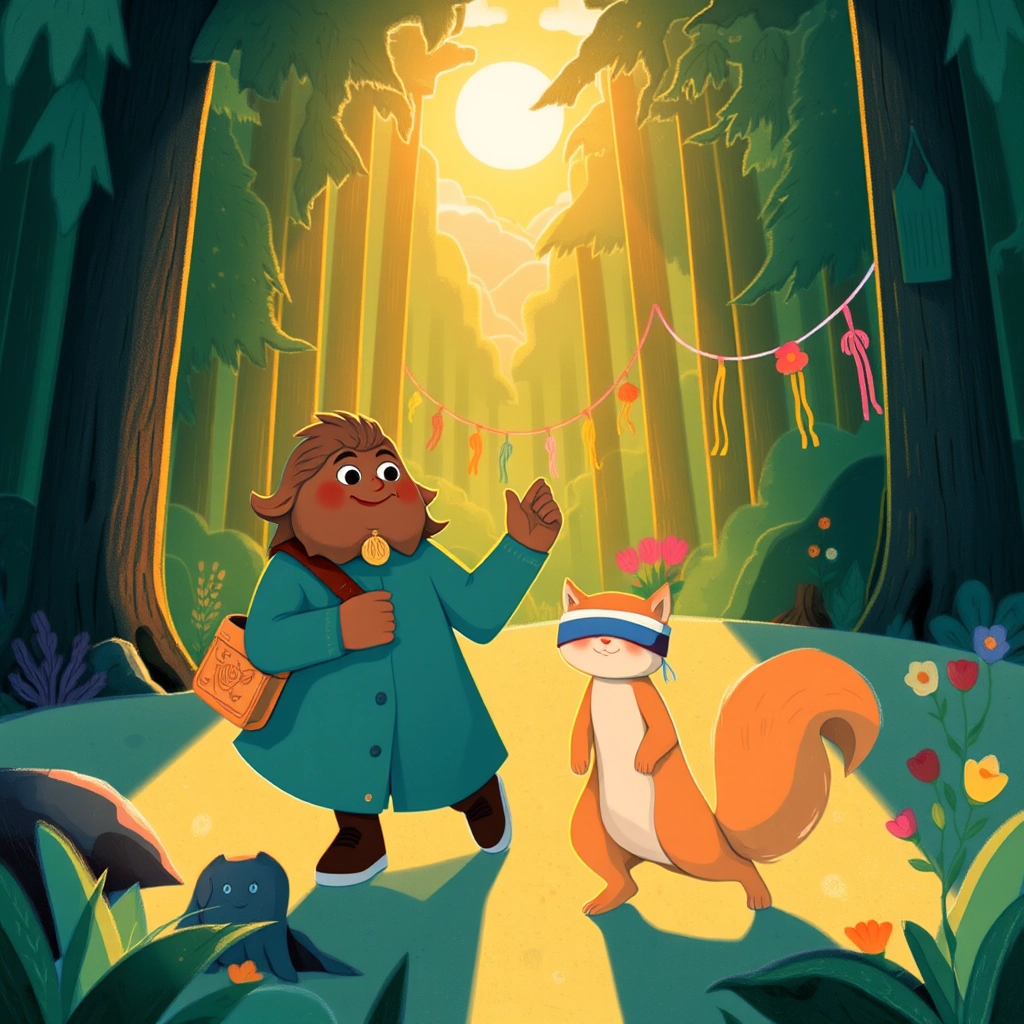 When evening arrived, [Boo Baba](GMLDQVMJ) gently guided [Hazelnut](33SDSSK9) to the large sunny clearing, covering his eyes with a soft blindfold. 'What’s going on?' [Hazelnut](33SDSSK9) asked nervously. [Boo Baba](GMLDQVMJ) didn’t say a word – only a few steps more, and then he removed the blindfold.