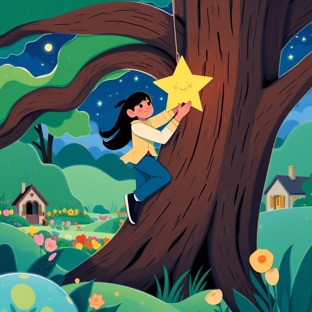 [Maya](SXVNL36M) suggested climbing her backyard's tallest oak tree to help [Stella](YN2D9MN2). [Maya](SXVNL36M) carried the glowing star carefully, feeling its warmth like sunshine as they climbed together.