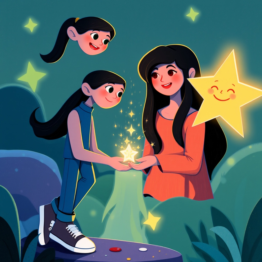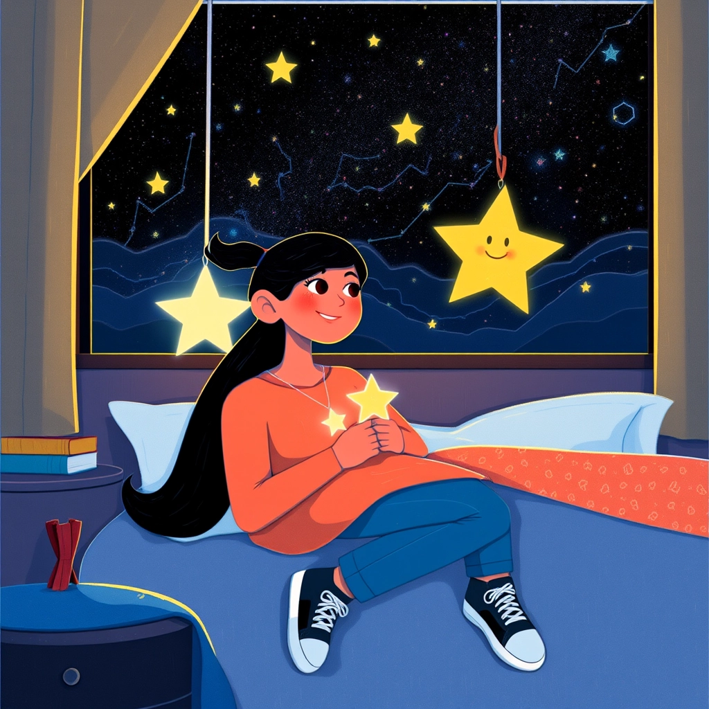 Whenever [Maya](SXVNL36M) feels scared, she touches her necklace and looks up at [Stella](YN2D9MN2) twinkling brightly among the stars. Wishes from brave hearts always come true.