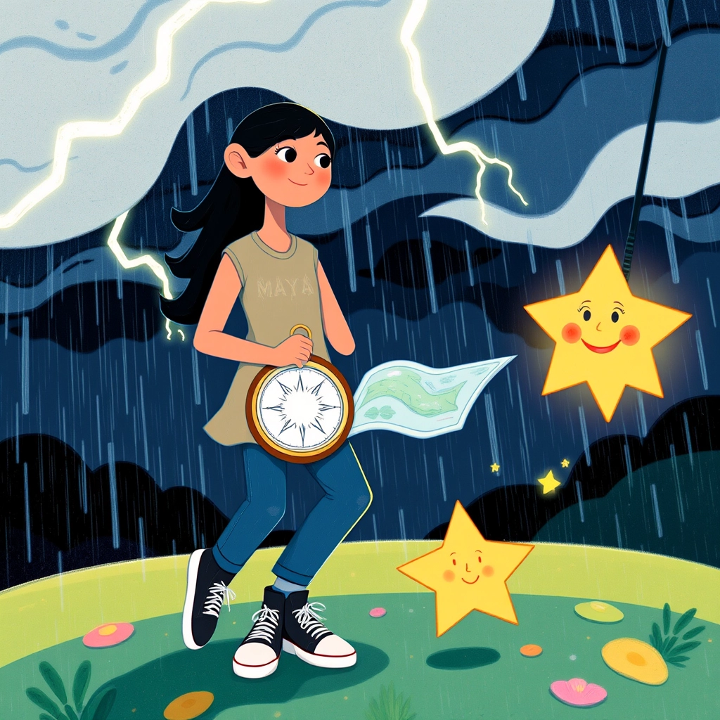 Storm clouds rolled in, but [Maya](SXVNL36M) had an idea. Using a compass and her star map, she guided [Stella](YN2D9MN2) through the storm to find her way home.