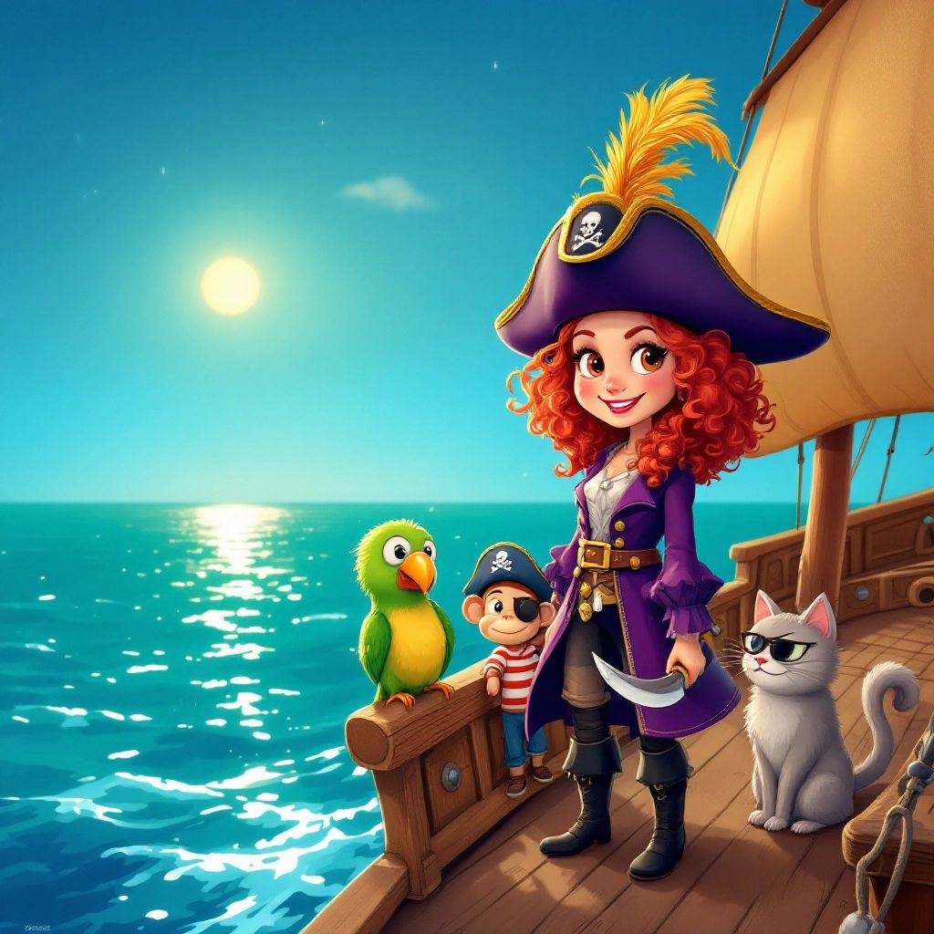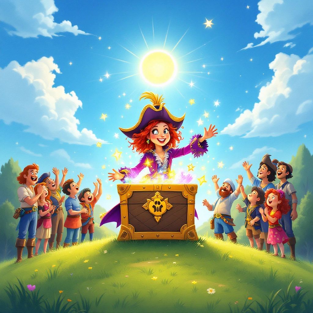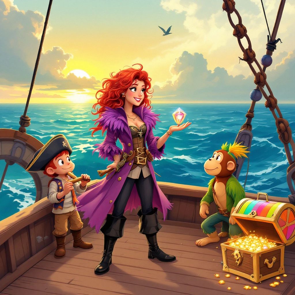 On a sunny morning, [Captain Sandy](6Z36S2KS) stood proudly on the deck of her ship, The Golden Gull. Her loyal crew gathered around her. Today, they were setting sail to find the legendary Rainbow Treasure, said to be hidden on the mysterious Isle of Colors.