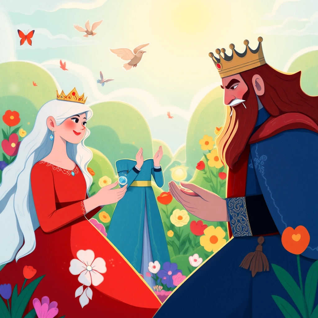 Long ago, in a land of sparkling rivers and towering mountains, lived two kings. The [White King](NLF67Z6M) ruled a peaceful kingdom with his three cheerful sons. His long gray hair and warm smile made everyone feel safe. On the other side of the valley was the [Red King](BCLSTDYV), whose fiery face and red robes made everyone tremble. He had three stunning daughters who adored palace life.