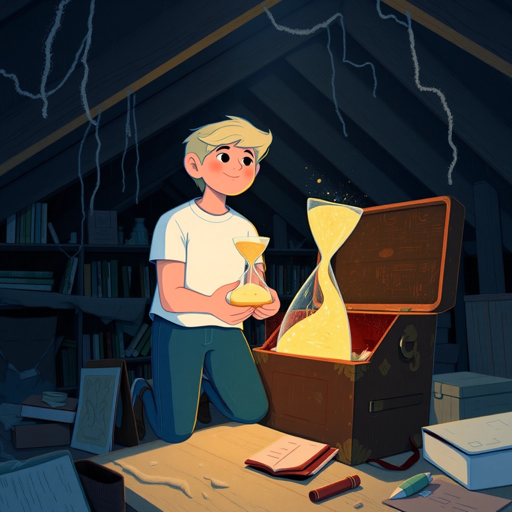 Curiosity got the best of [Sam](QCJHZMZW). Climbing the creaky attic stairs, they found a dusty old trunk tucked under the eaves. Inside was a strange sand timer with golden sand that sparkled like stars. 'Whoa,' [Sam](QCJHZMZW) whispered, turning it in their hands.
