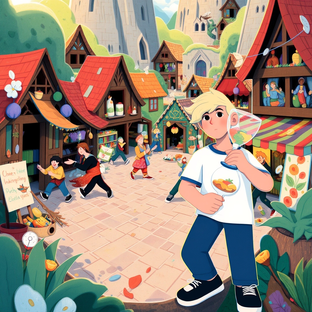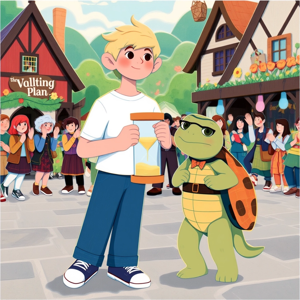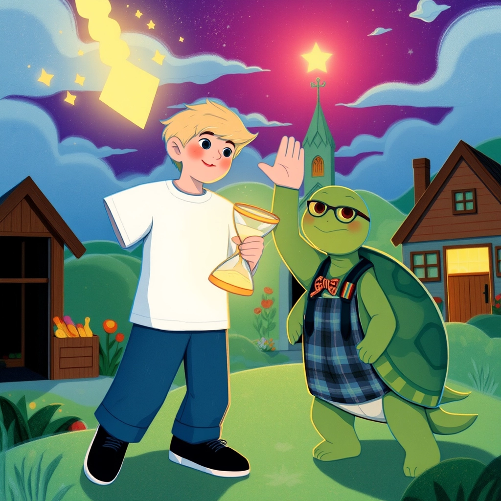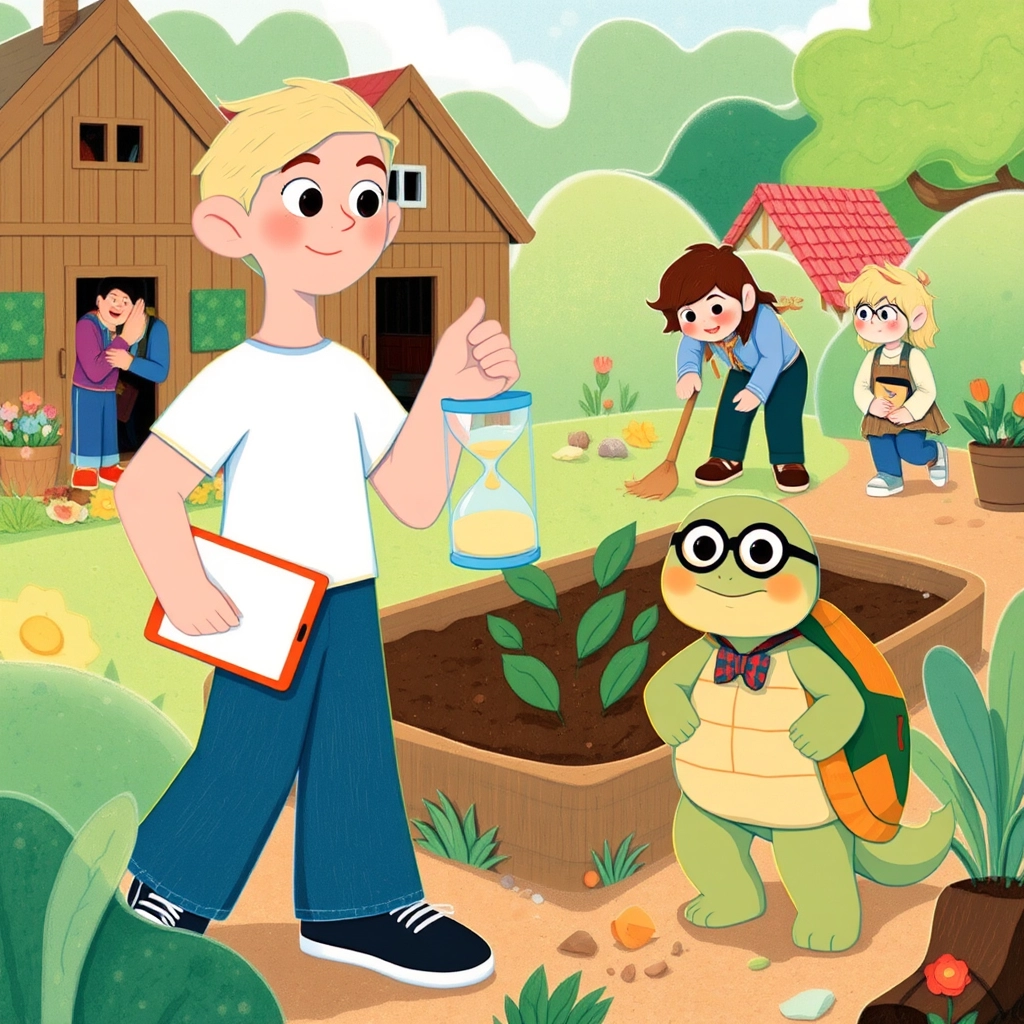 'This is Timely Town,' [Tinker](JBFCKV3Q) explained. 'We never finish anything because we get so overwhelmed. Houses are half-built, gardens are half-planted—it’s a mess!' [Sam](QCJHZMZW) looked down at the sand timer. 'Maybe this could help!'