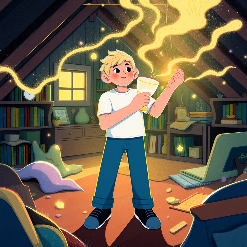[Sam](QCJHZMZW) sat cross-legged in their messy room, surrounded by toys, books, and clothes. They sighed loudly. 'Cleaning is so boring!' they groaned, flopping back on the carpet. Then, a creak above made them pause. 'The attic?' [Sam](QCJHZMZW) whispered.