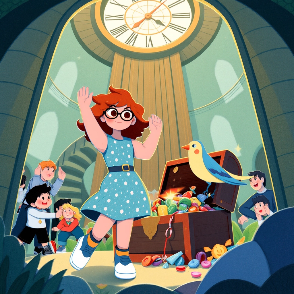 Finally, the last clue brought the group to the big clocktower. [Lila](QKHMTNXW) bravely climbed the spiral stairs with the others and found the treasure chest sitting at the very top. They opened it together and found candies and toy necklaces!