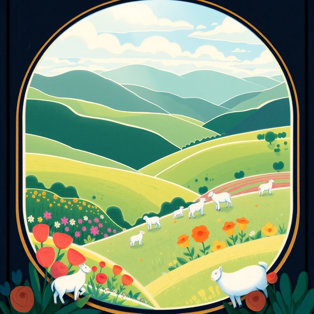 The countryside rolled past like a painting: green meadows, colorful wildflowers, and sheep grazing peacefully under the sunny sky.