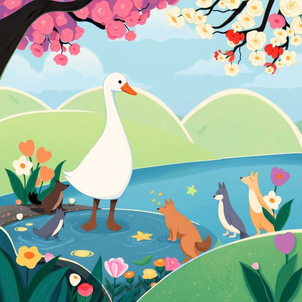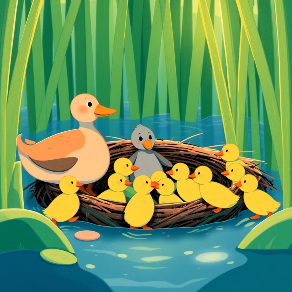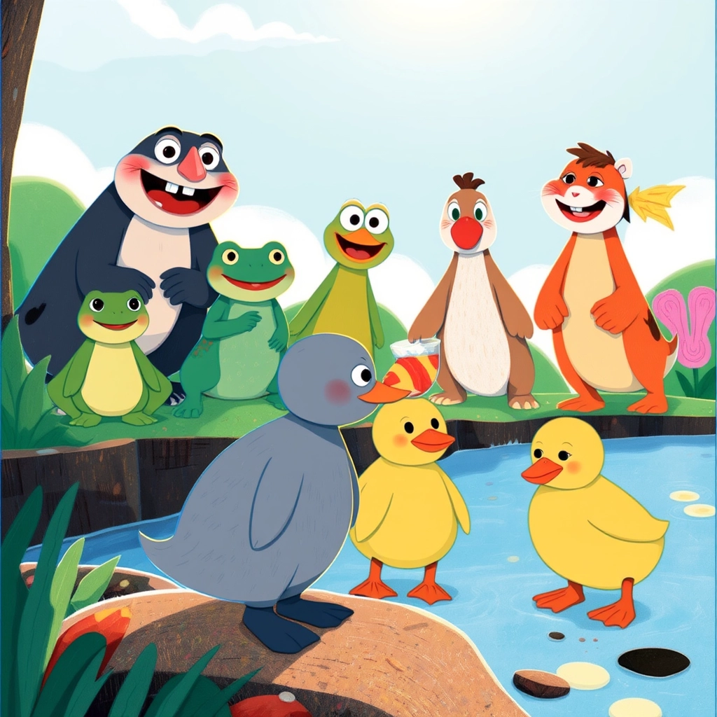 Once upon a time, in a quiet pond surrounded by tall reeds, a family of ducklings hatched one by one. They were all bright yellow and fluffy—except for one. His feathers were gray and dull, nothing like his siblings.