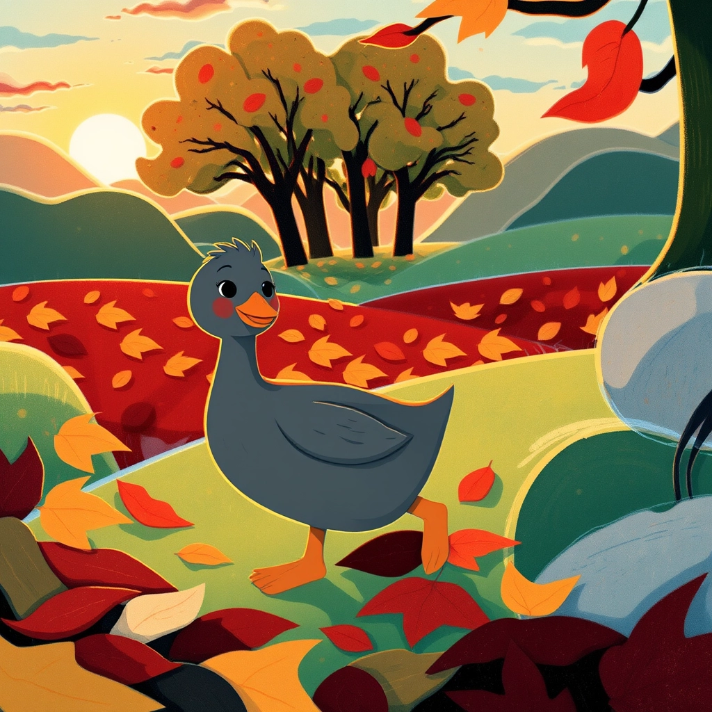 Autumn arrived, painting the world in golden and crimson hues. The gray duckling marveled at the beauty, though a chill reminded him how far he was from home.
