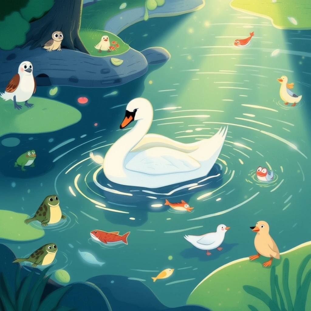When the animals of the pond saw him, they gasped in amazement. The same creatures who had once laughed at him were now speechless at the sight of his beauty.