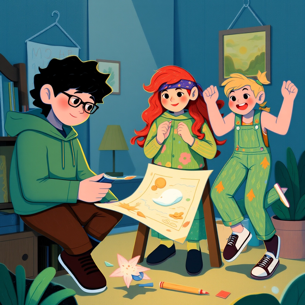 [Milo](W294DR7C) showed her how to turn a confusing pile of treasures into a 'Treasure Map,' while [Zara](V5PLYCSC) painted pictures of each item so [Lily](BNDXSFV9) could display her amazing collection.