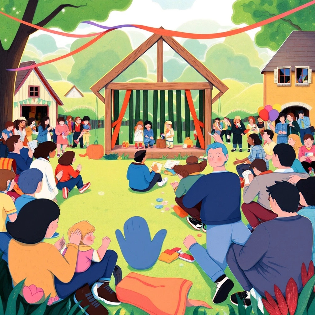 On the big day, people started to gather by the stage, excited to see what the children had prepared. The village square was bustling, and a cheerful hum of chatter filled the air.