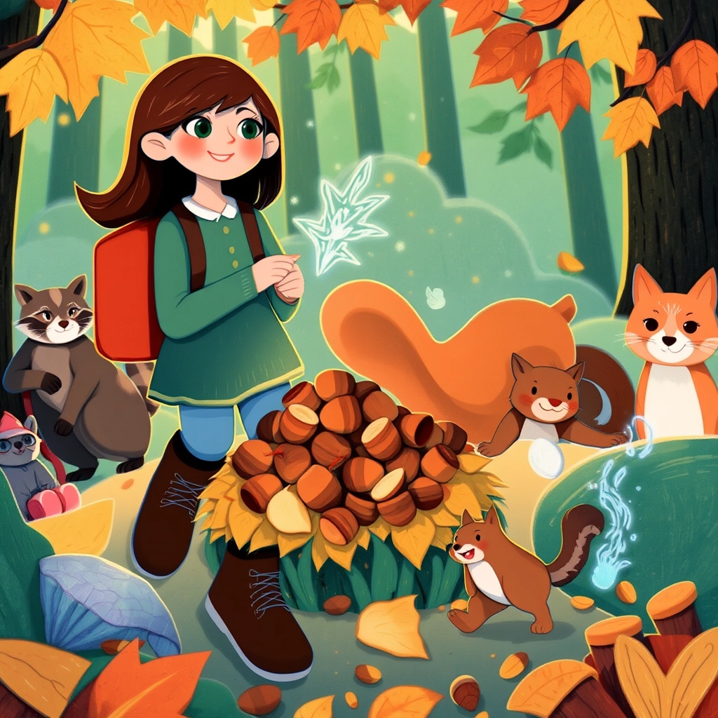 [Lily](9JQPYXQQ), [Flicker](4XLTF4K7), and the other animals worked together, searching high and low for the squirrel’s acorns. Finally, they found them under a pile of leaves, and the squirrel’s face lit up with joy.