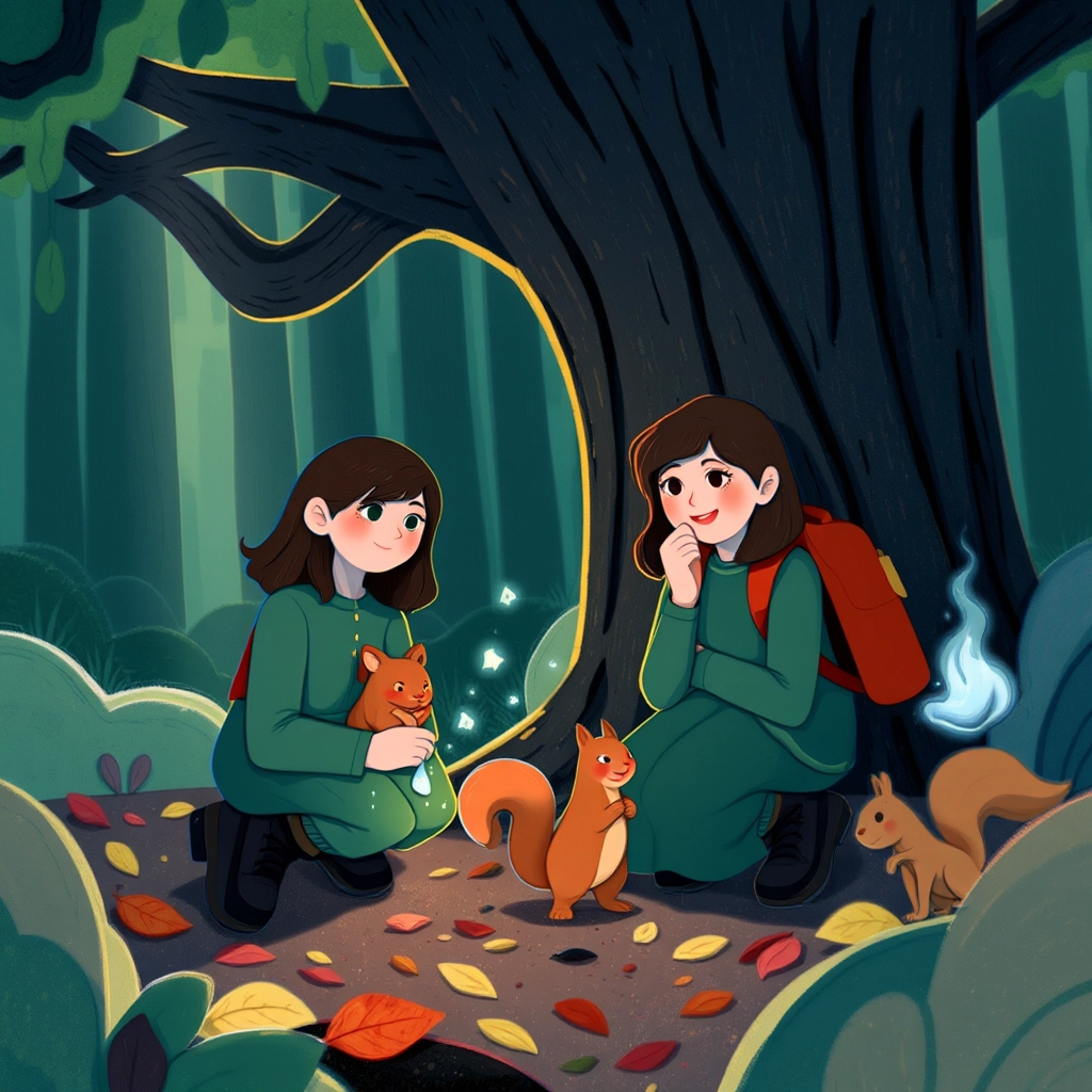 Deeper in the woods, they found a squirrel crying under a tree. 'I lost my acorns, and winter is coming!' The squirrel sobbed. [Lily](9JQPYXQQ) immediately wanted to help. 'Kindness makes the world better,' [Flicker](4XLTF4K7) said.