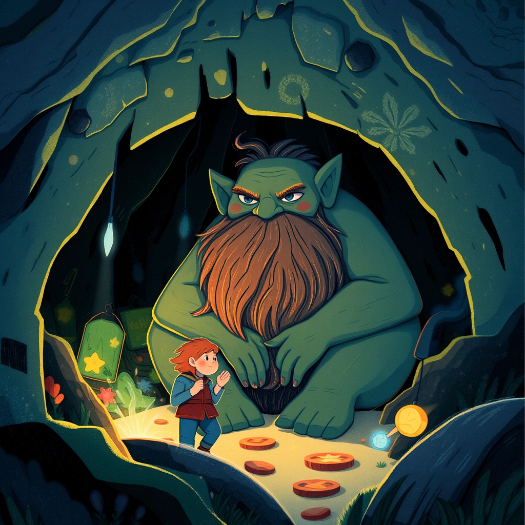 Inside the cave sat [Grumble](R49W75YR), a hulking troll with a scruffy beard and a pile of treasures, including the Heartstone—a dazzling red gem pulsing with life. 'Who dares enter my cave?' he growled.