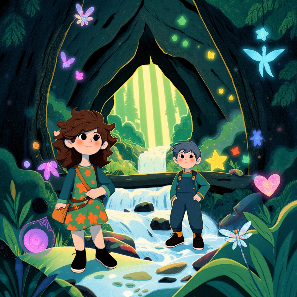 [Flicker](CL4TPZG7) led [Mia](5C2WSBLJ) and [Leo](MY7M2HXS) through winding paths filled with glowing mushrooms and chattering squirrels until they reached a rickety bridge. On the other side stood a dark, mossy cave.