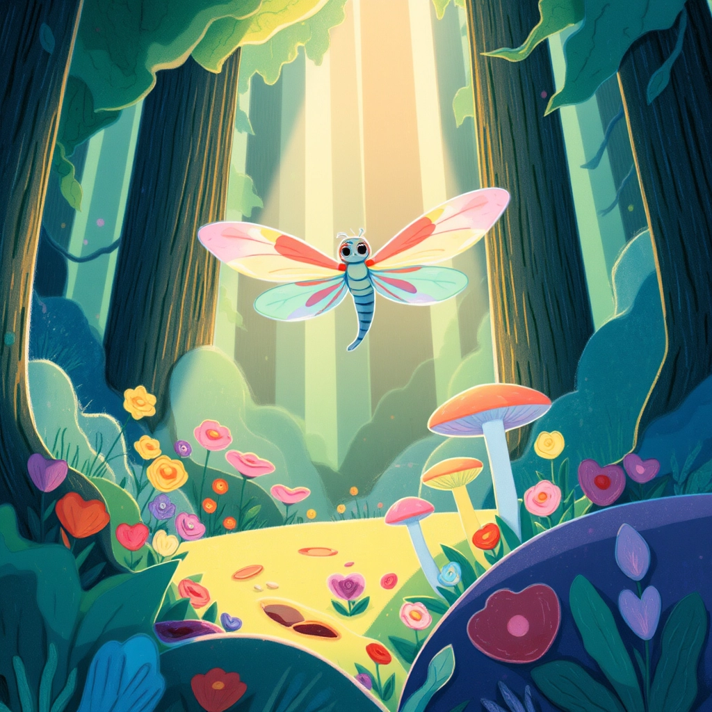 As they walked deeper into the woods, the magical hum grew louder. Soon, they stumbled into a clearing where a glowing creature hovered—it looked like a dragonfly made of light, its shimmering rainbow wings radiating a magical aura.