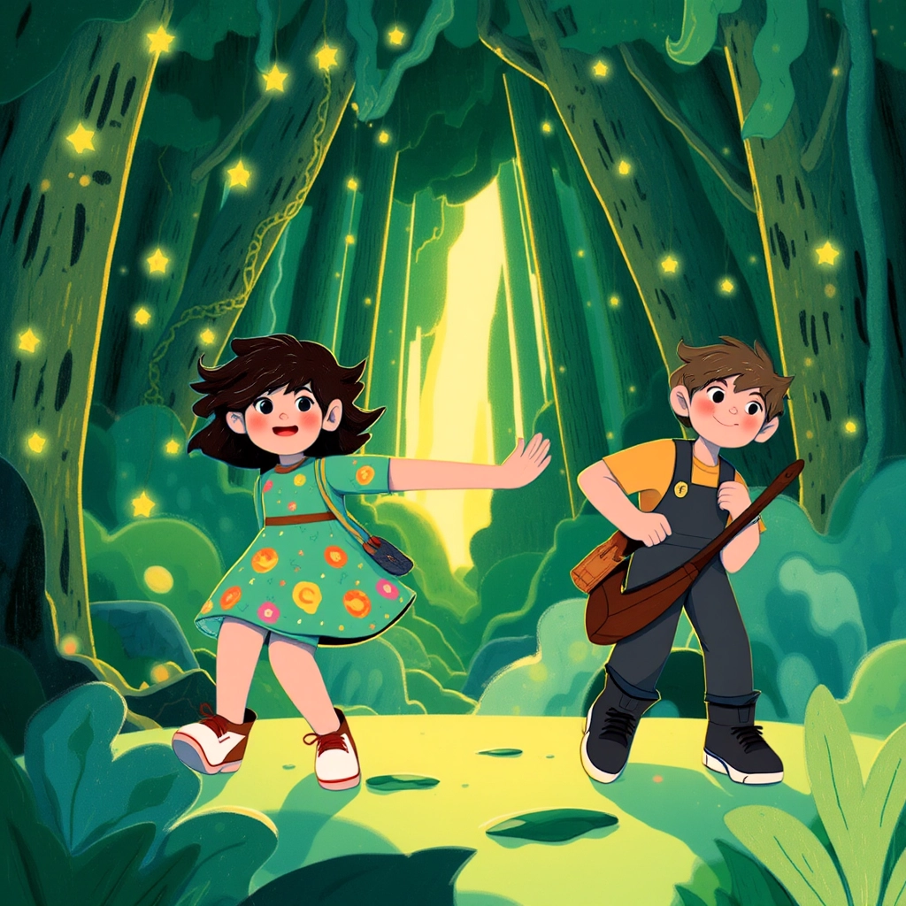 One sunny afternoon, as they played by the riverbank, a strange, soft musical hum floated through the air, coming from the Whispering Woods—a mysterious place the grown-ups always warned the children to avoid.
