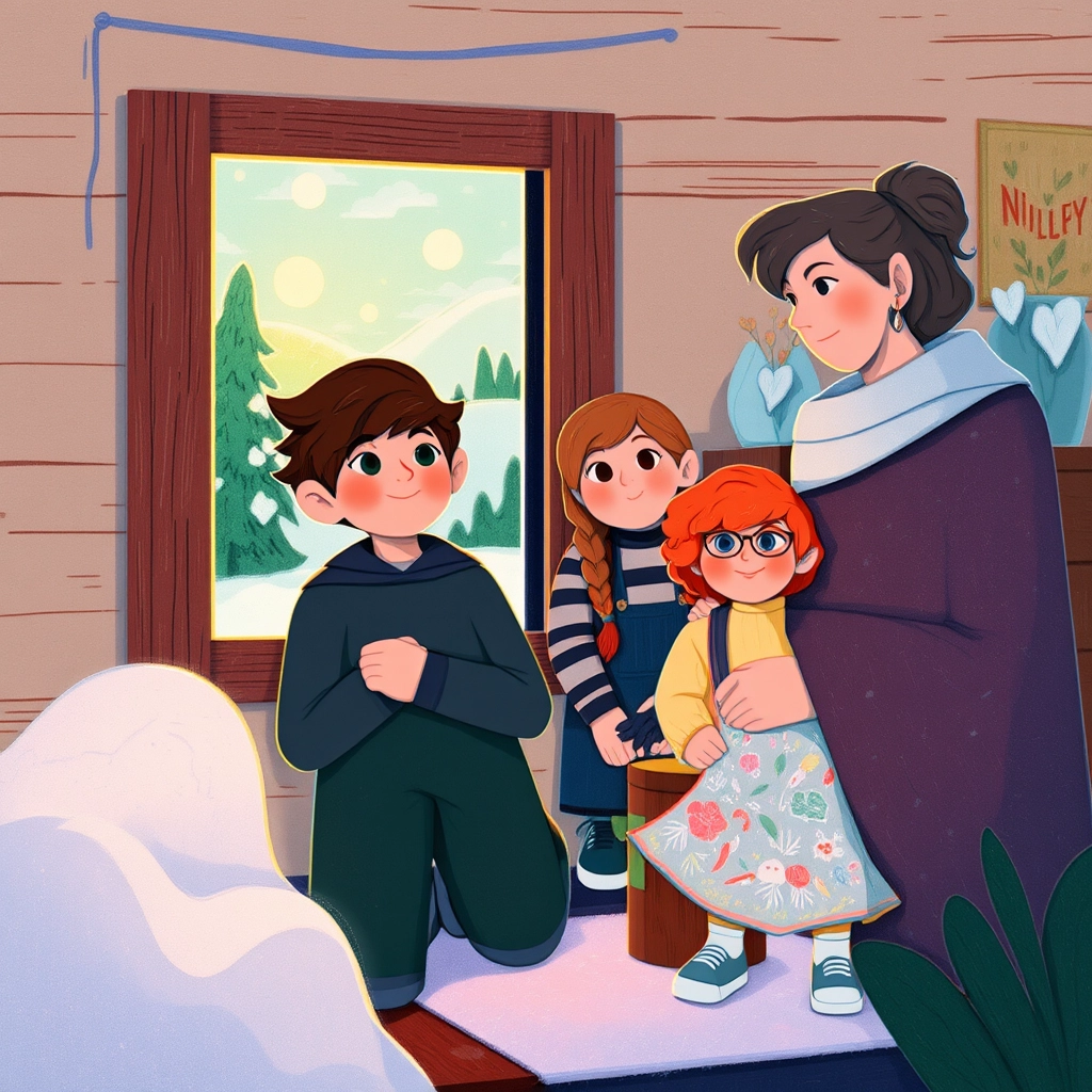 One snowy morning, [Milo](6FCY3NZ2) asked, 'Mama, how do you smile even when things are tough?' [Mrs. Eloise](JPWS55VK) replied with a twinkle in her eye, 'Kindness and creativity go a long way, my dears.'