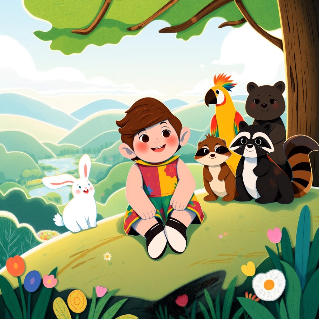 As they journeyed together, they found themselves in a sunny meadow filled with buzzing bees and fluttering butterflies. Suddenly, a raccoon named Rocky peeked out from behind a tree. Rocky had a bushy striped tail, and he wore a mischievous smile. ‘Is there room for one more?’ he grinned. 'Always!' laughed [Bubby](H2HLBTCJ).