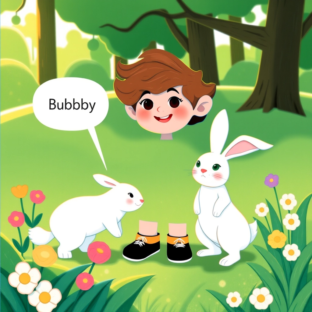 As [Bubby](H2HLBTCJ) wandered deeper into the wild grassy patches, he met a cheerful rabbit named Thumper. Thumper had the softest white fur, long floppy ears, and a little pink nose that twitched as he talked. 'Where are you off to, [Bubby](H2HLBTCJ)?' asked Thumper. 'Everywhere!' [Bubby](H2HLBTCJ) grinned.