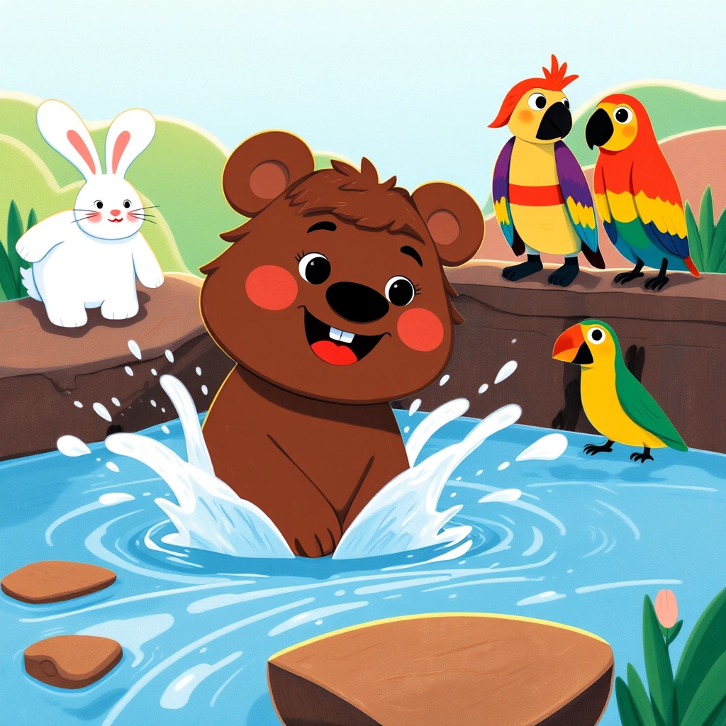 Soon, they came to a sparkling stream where a happy bear cub named Buddy was splashing and playing. Buddy had shaggy brown fur and big, round ears. 'Want to join my adventure?' asked [Bubby](H2HLBTCJ). 'Splash-tastic!' answered Buddy as he waded out of the water.