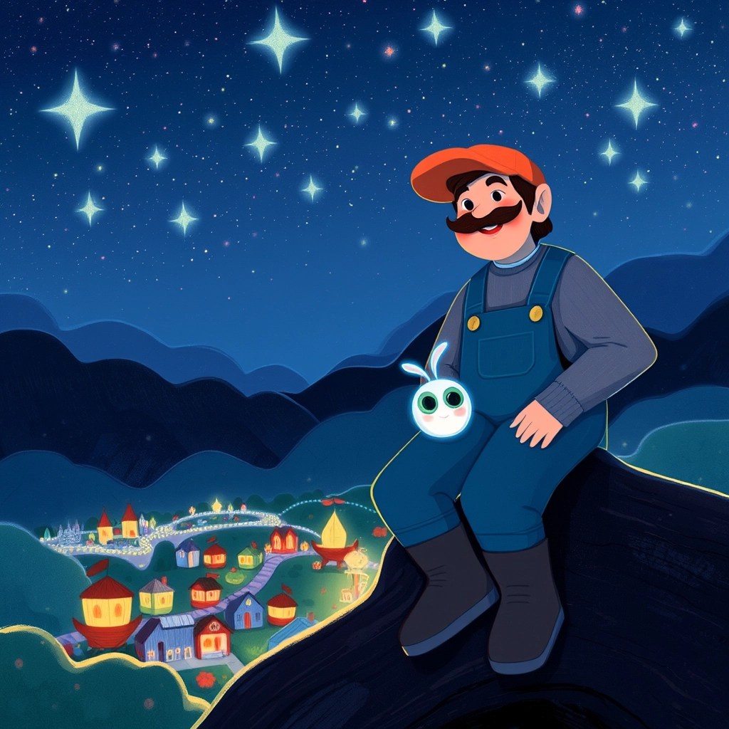 As the day ended, [Tom](NNCHPVMR) showed me the glowing stars from the top of a tall tree. 'Your world is fascinating,' I said. 'But it's time for me to head back to space.' Everyone waved goodbye and promised to remember their tiny visitor.