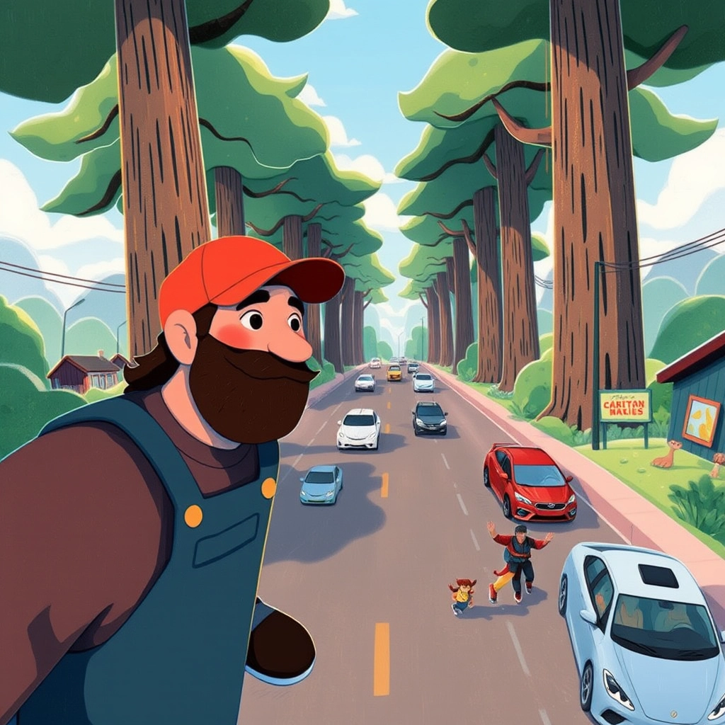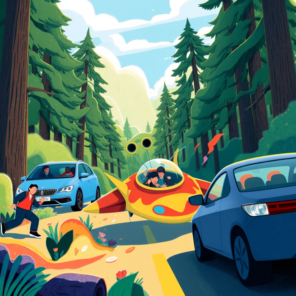 Zoom! I was flying my little spacecraft through the galaxy when I accidentally zipped through a glittering wormhole. Wham! I landed on a world where everything was huge—tree trunks as wide as spaceships, people taller than the clouds, and strange four-wheeled machines zooming around like they were alive! I looked around in awe.