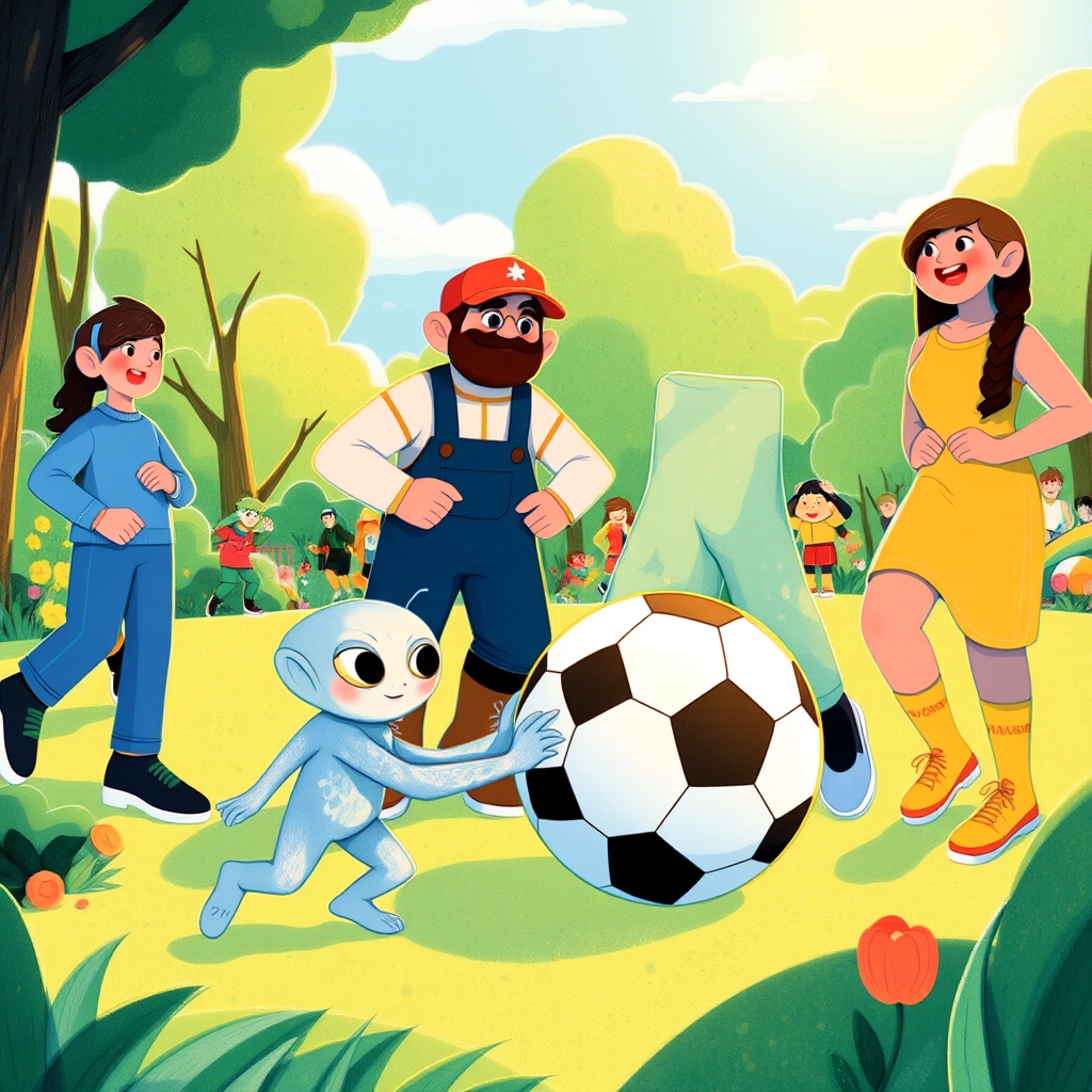 [Tom](NNCHPVMR) took me to a nearby park where other friendly tall folks were playing games. A cheerful tall woman named [Mia](CW7YSY46) let me try something called a 'soccer ball.' It was so huge, I could sit on it! Everyone laughed as I tried rolling it around.