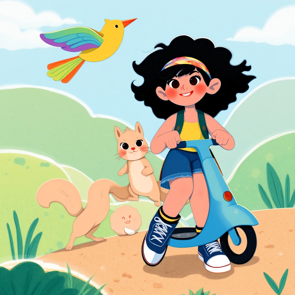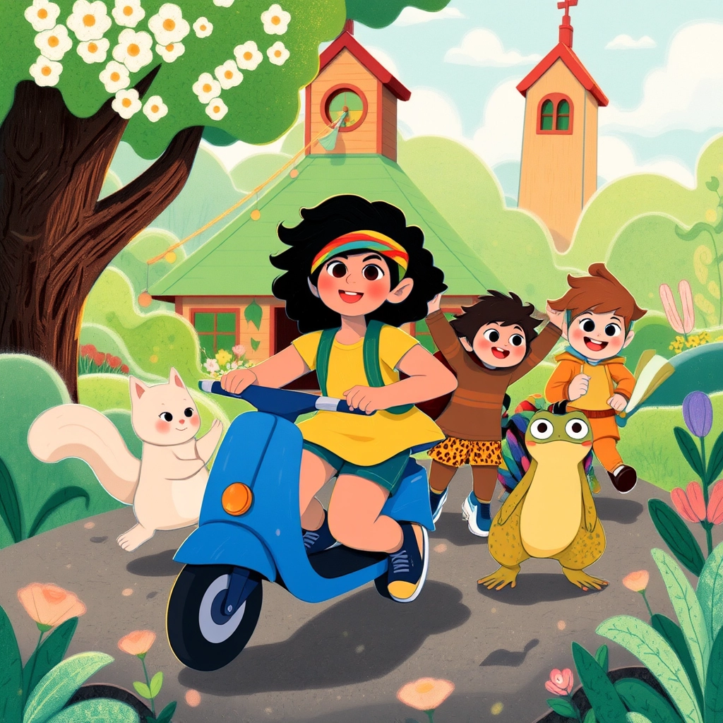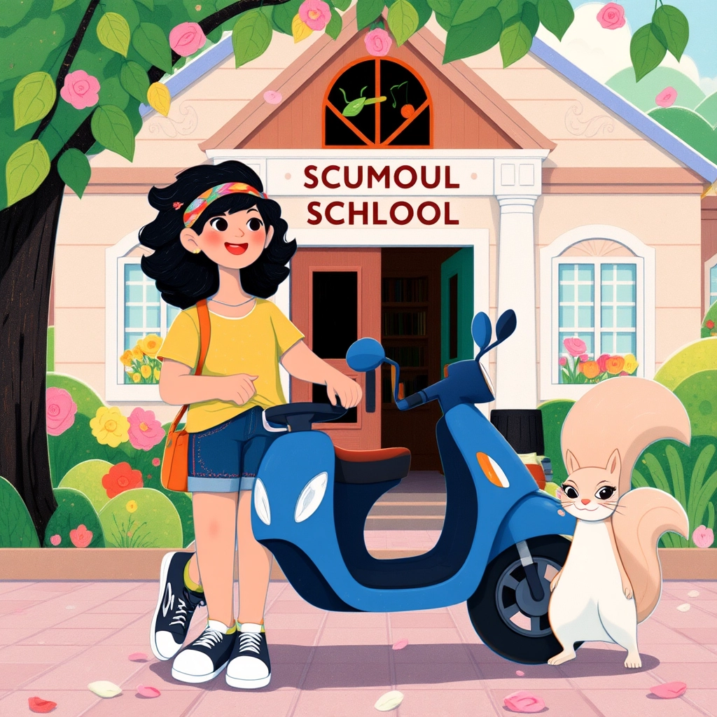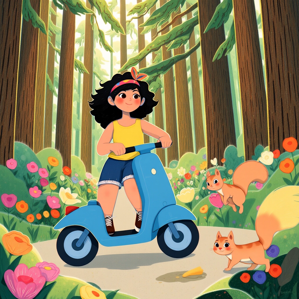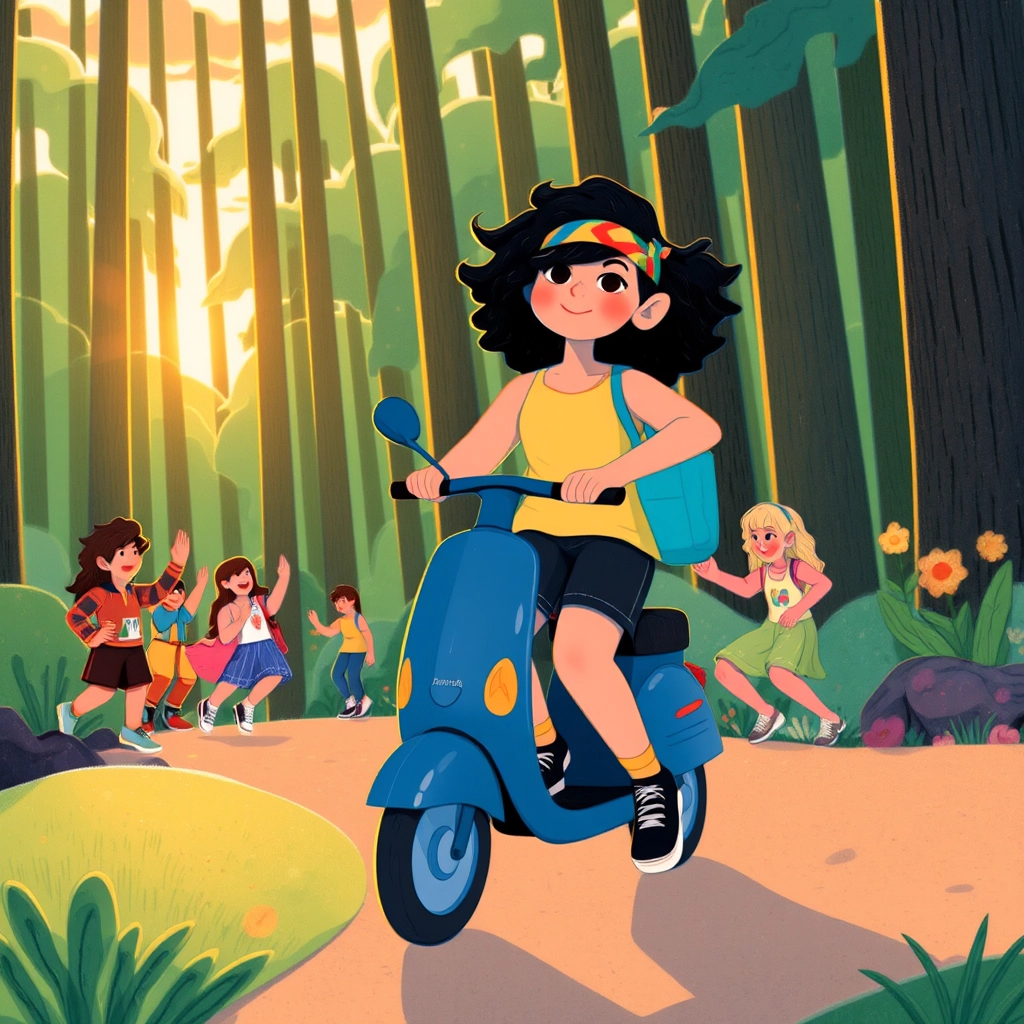 [Theai](5P9YRNGP) woke up bright and early, ready for her scooter ride through the enchanted forest on her way to school. She had a shiny blue scooter that she loved dearly—it sparkled like the sun!