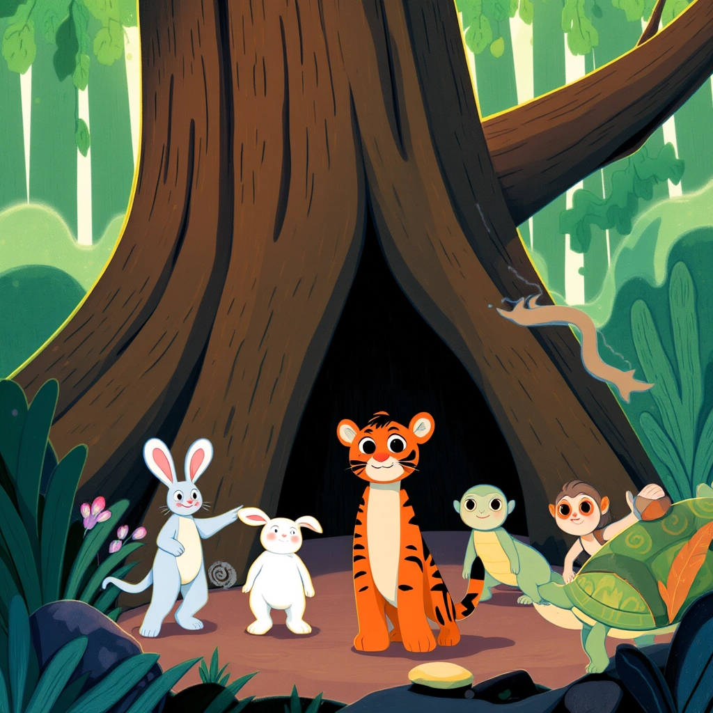 'Of course!' said [Tigo](RBSMWLVC). Soon, they were joined by [Ollie](CN4V4F6P) the owl, known for his wisdom, [Nimble](DGFGWL6N) the brown monkey, and [Shelly](Q36BPPMW) the little green turtle. Together, they began their adventure deeper into the forest.
