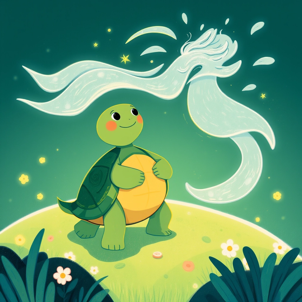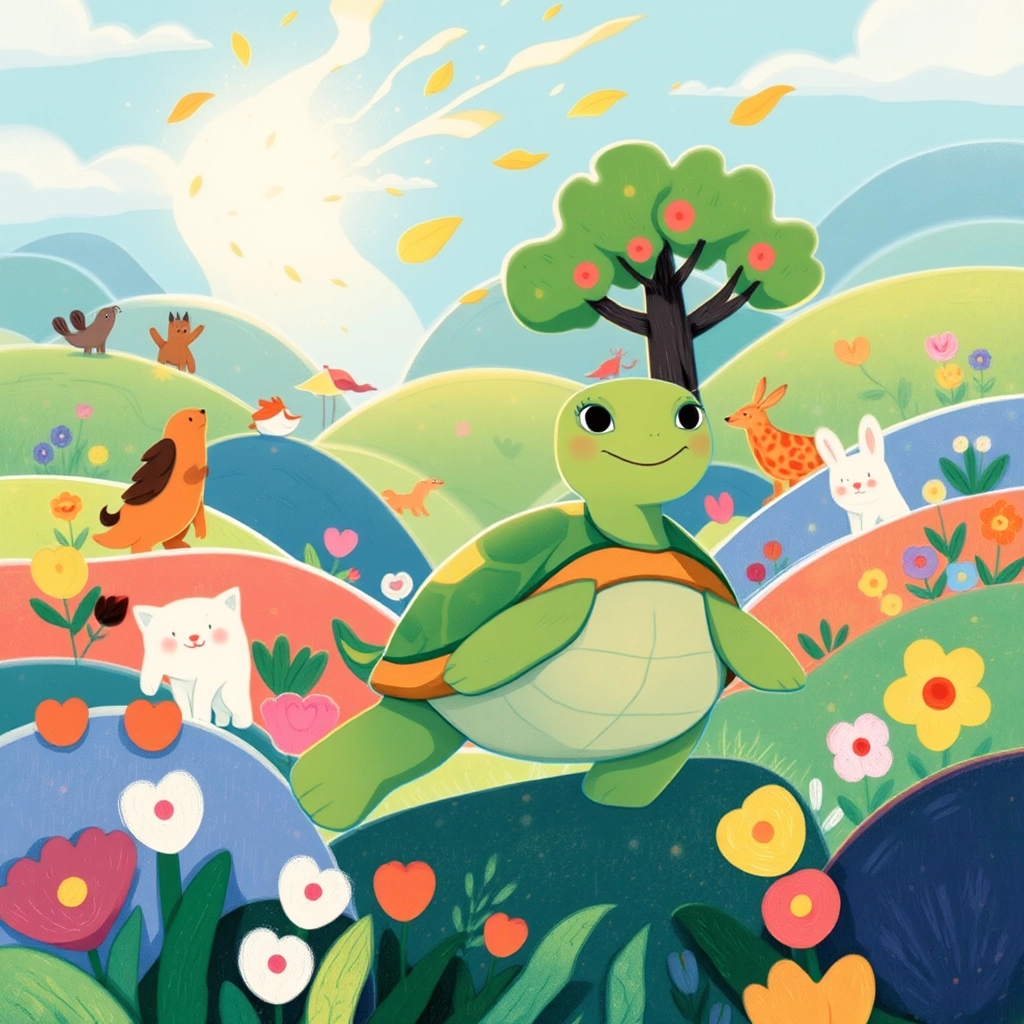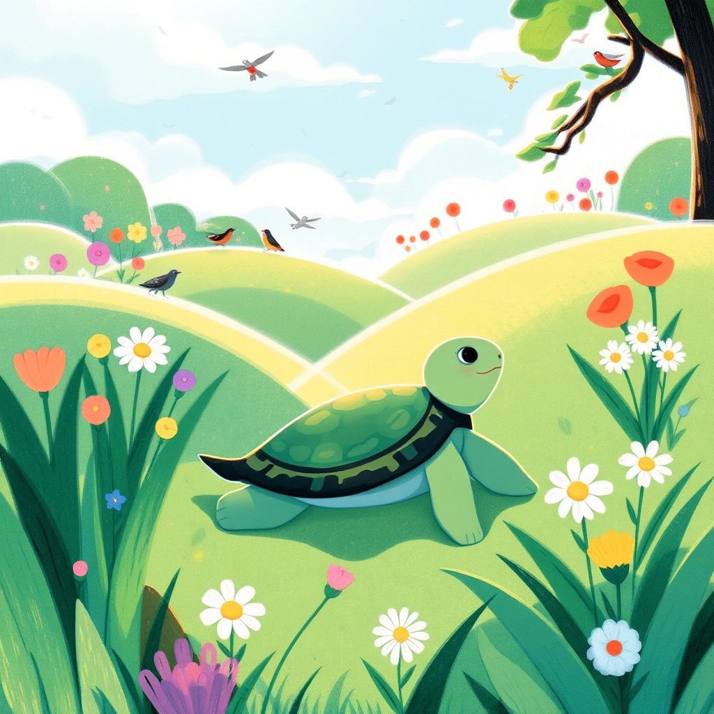 In a quiet meadow, where flowers danced and the sun smiled, lived [Tiko](XL4P3TRZ) the Slow Turtle. He had a shiny green shell, stubby legs, and a big heart.