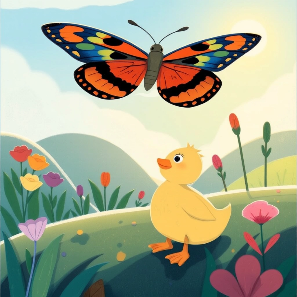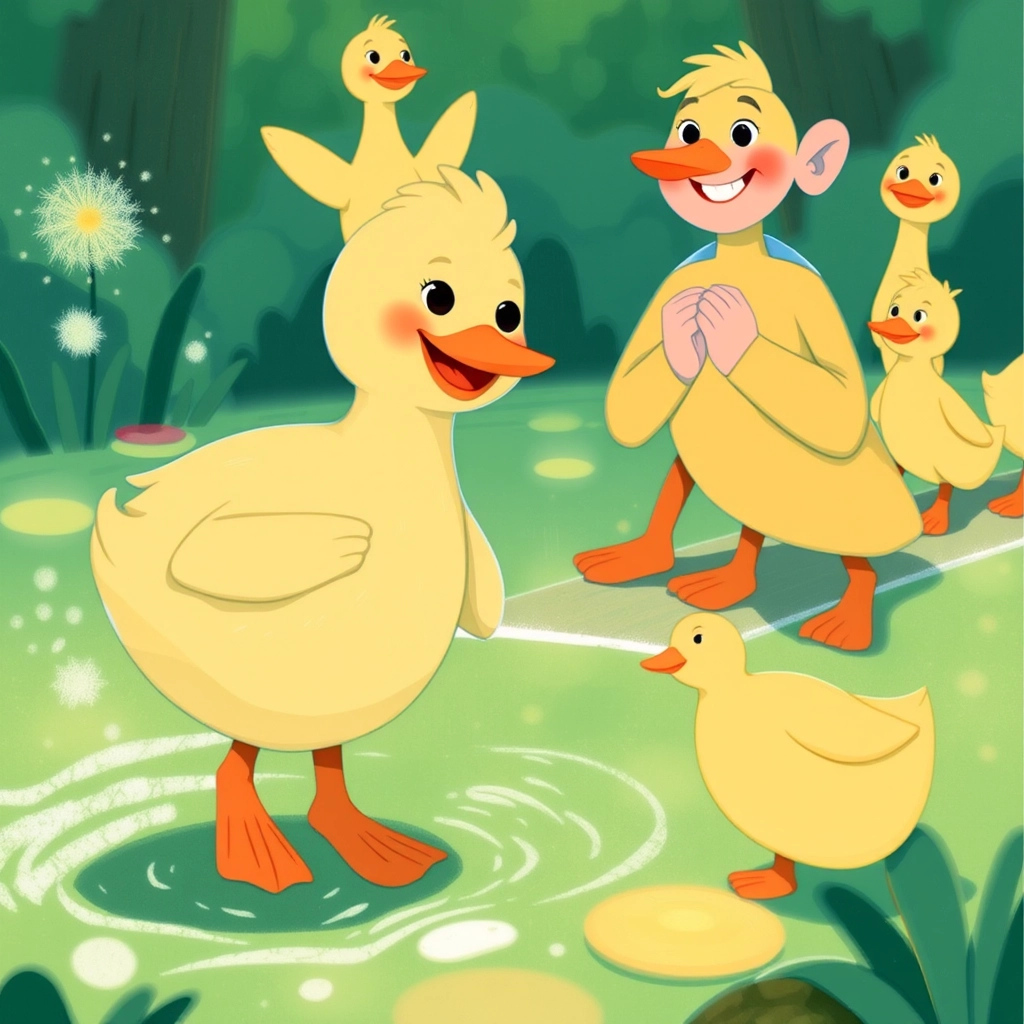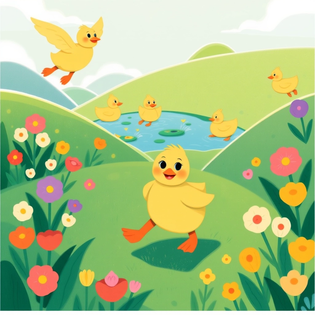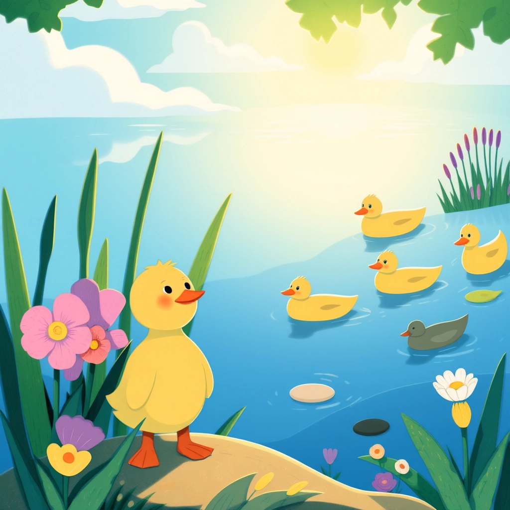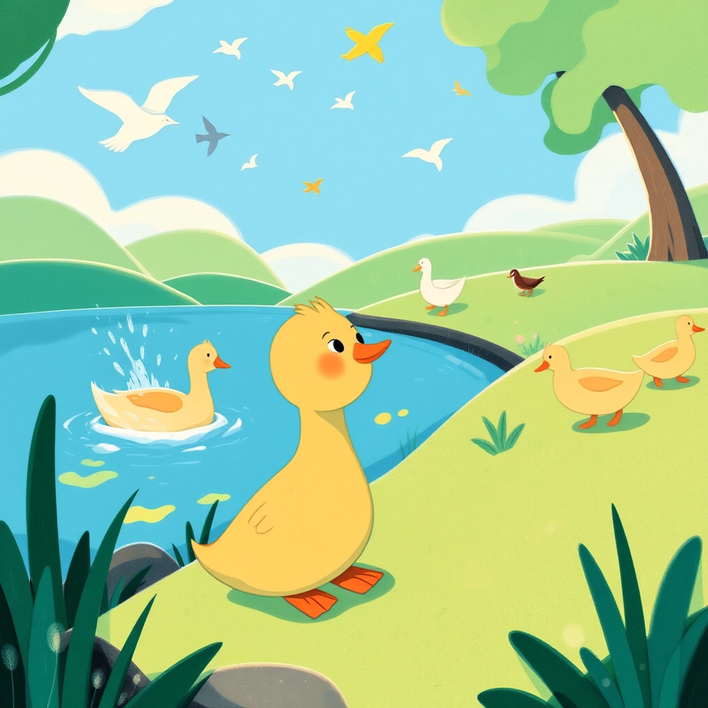 [Timmy](MFQ73462) often watched the older ducks diving, waddling, and flying high. He sighed, thinking, 'I can't do any of those things. I'm too little.'