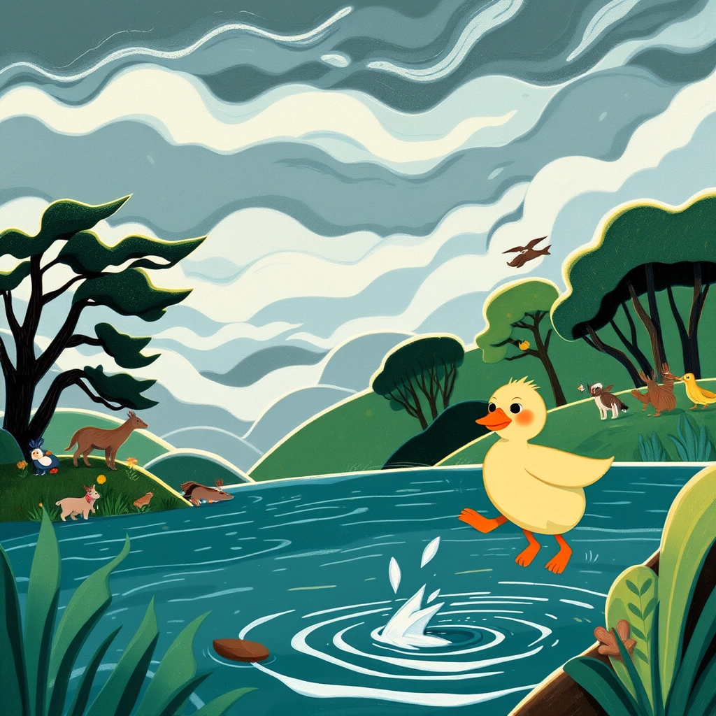 One blustery day, a strong wind rattled the pond. Suddenly, a baby duckling, no bigger than a ball of fuzz, was blown out of her nest and into the water!