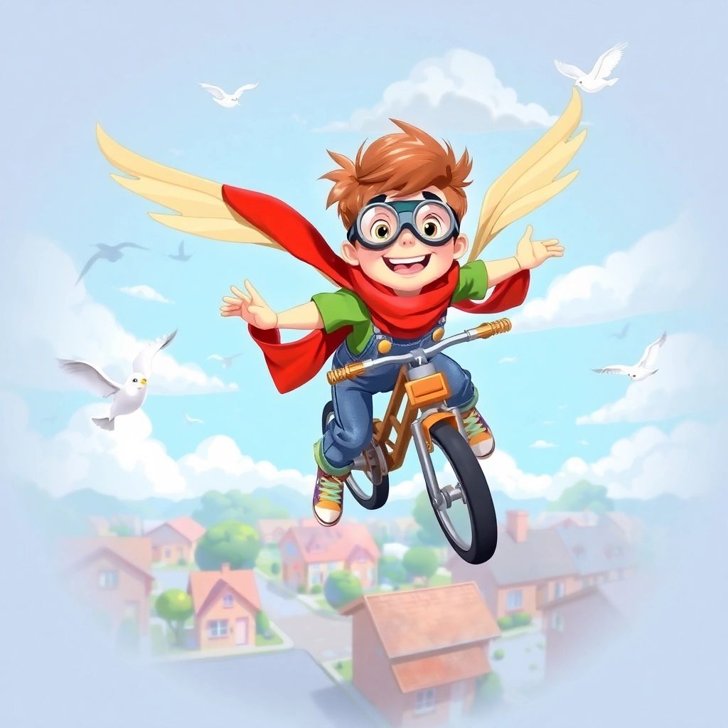 [Timothy](W2HMKBF3) climbed onto the bike, took a deep breath, and pedaled as fast as he could. With a WHOOSH, the wings flapped, and the bike lifted off the ground and into the sky! [Timothy](W2HMKBF3) zoomed over houses, trees, and clouds, yelling, 'It works! It works!'