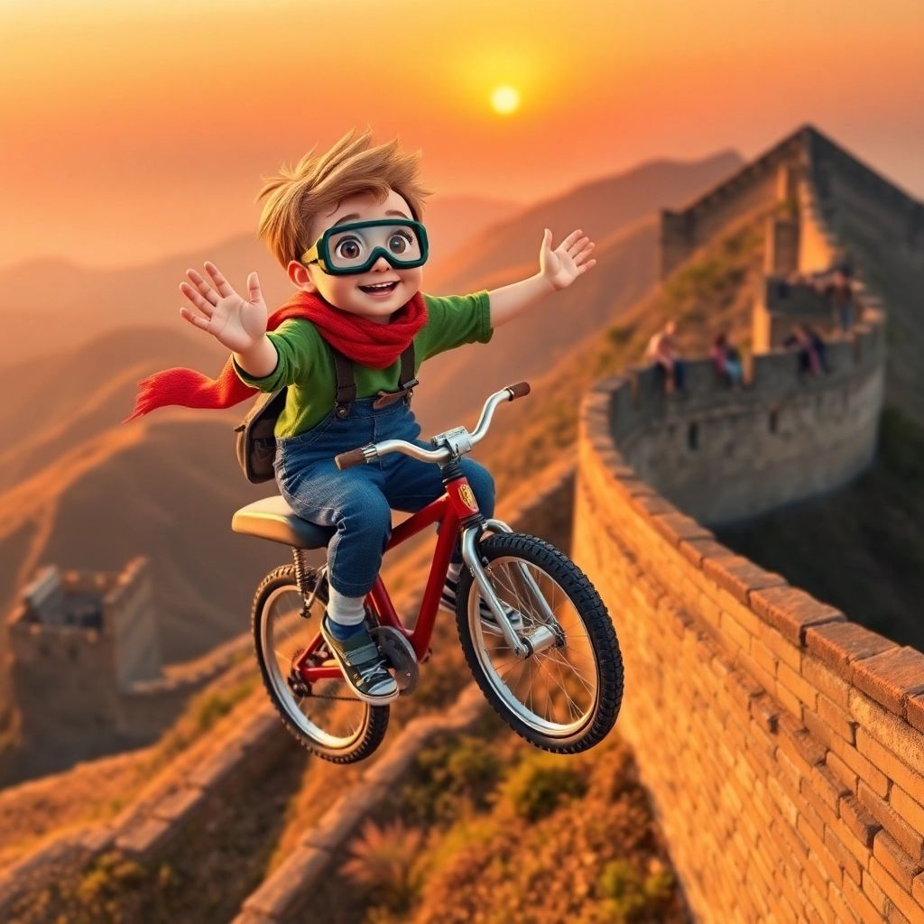 At sunset, [Timothy](W2HMKBF3) flew over the Great Wall of China, marveling at its towering structure stretching for miles. A family waved to him from the top, amazed by his incredible invention, and he waved back with a big grin.