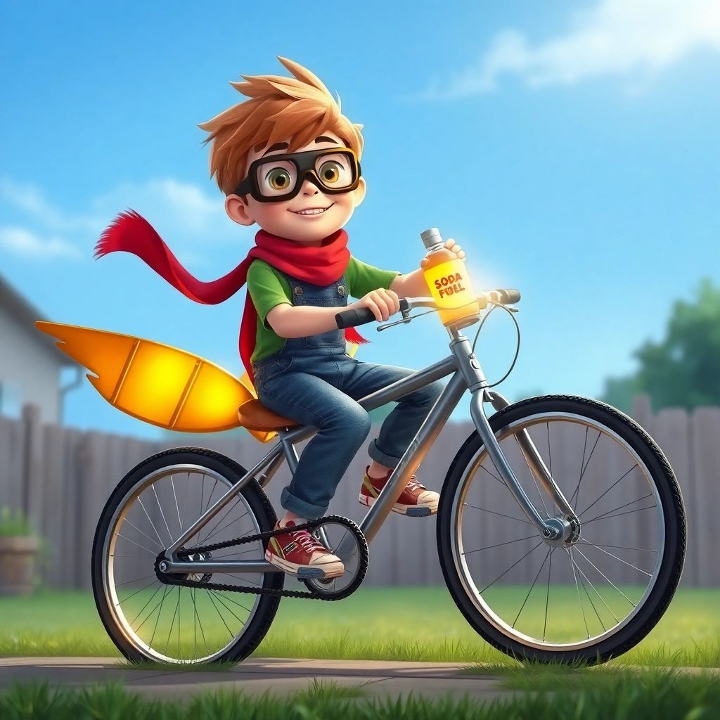 After weeks of tinkering, fixing, and adding wings to his favorite bike, it was finally ready. The Flying Bicycle 3000 stood tall with shiny golden wings and motors powered by [Timothy](W2HMKBF3)'s special invention: fizzy rocket fuel made from soda!