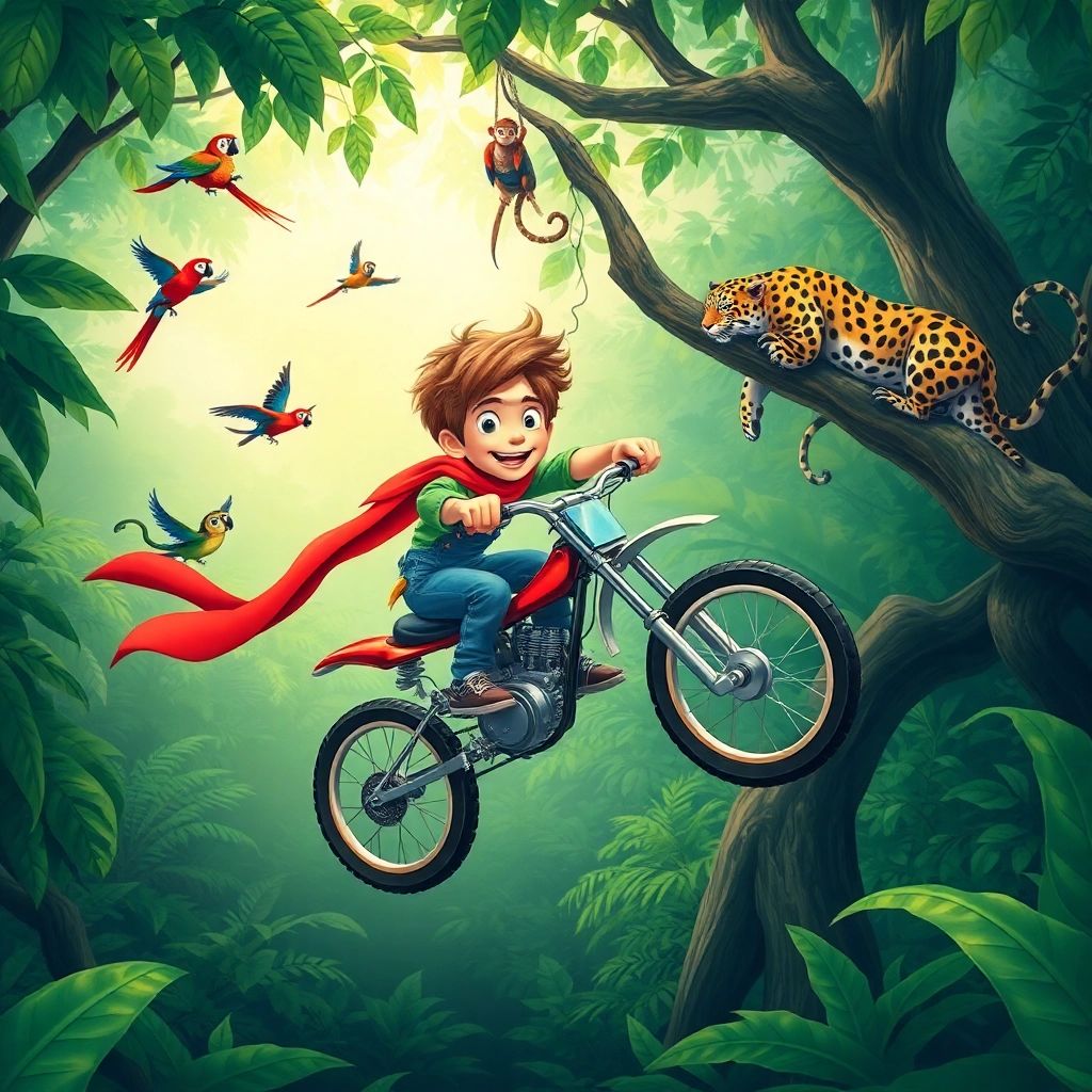 After a quick fuel-up with an extra bottle of soda rocket fuel, [Timothy](W2HMKBF3) soared toward the lush Amazon rainforest. The jungle came alive with colorful parrots, monkeys, and even a curious jaguar, all fascinated by [Timothy](W2HMKBF3)'s flying bicycle.