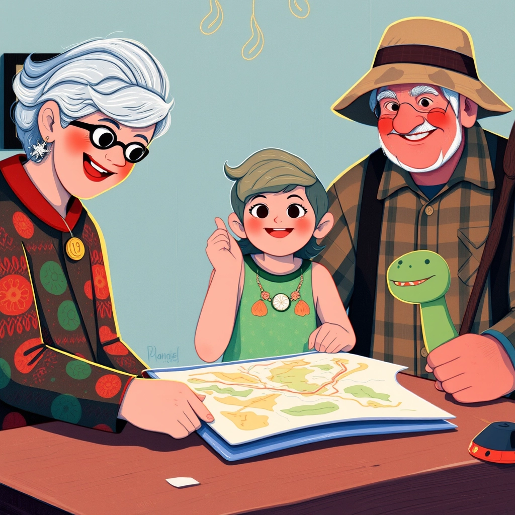 [Granny Heather](NSVG5VNC), with her reading glasses perched on her nose, studied the map. 'Hmm, it looks like the treasure is at Adventure Hill!' [Papa Curt](W2JSPD4Q) looked at the kids with a smile, 'I'll help you get there!'