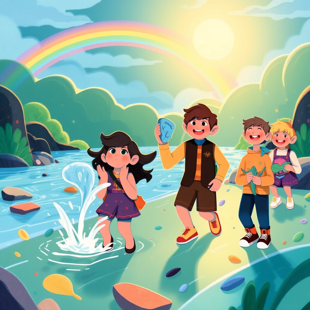 The first stop was Rainbow River, where they splashed in the cool water and collected pretty stones. 'These will be our treasure markers!' [Mallonei](77X52HTT) declared. [Bentley](32P3ZV7W) found a shiny blue stone that made him cheerful.