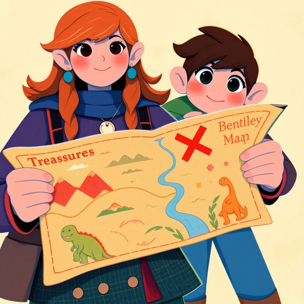 The map was decorated with hand-drawn doodles of mountains, rivers, and a big red 'X'. Excited, [Mallonei](77X52HTT) exclaimed, 'Let's go find the treasure!' [Bentley](32P3ZV7W) eagerly agreed, and they called for their family.